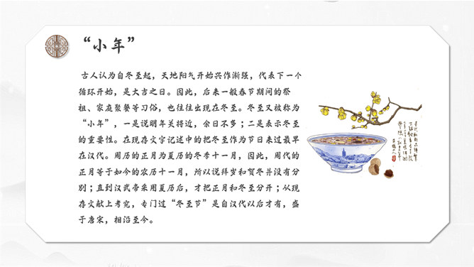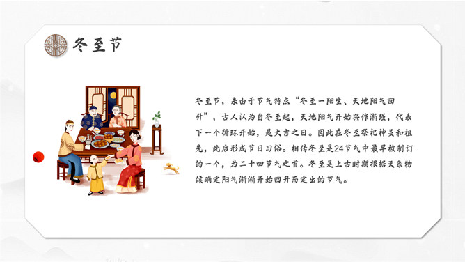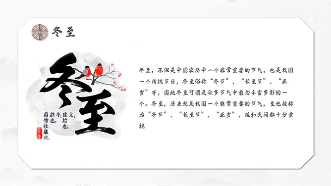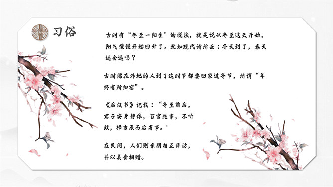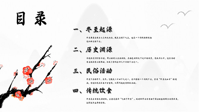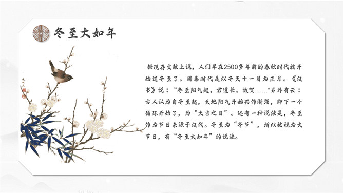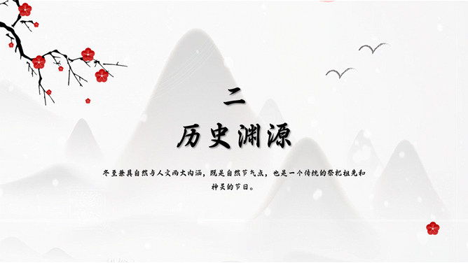 梅花红日冬至节气PPT模板。冬至,历来就是我国一个非常重要的节气,至也被称为“冬节”、“长至节”、“亚岁”、廷和民间都十分重视。
