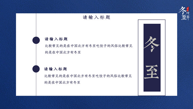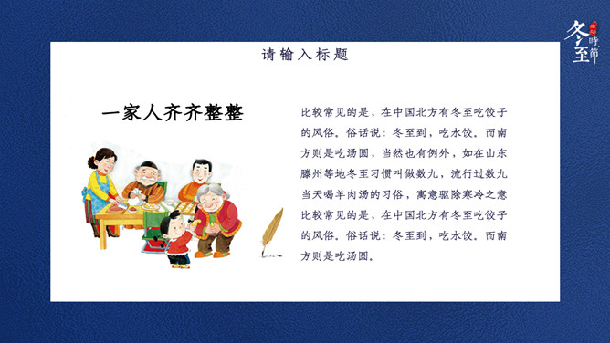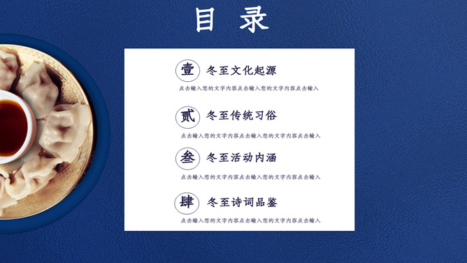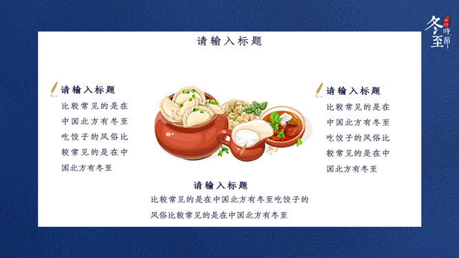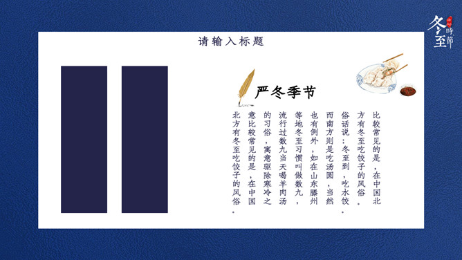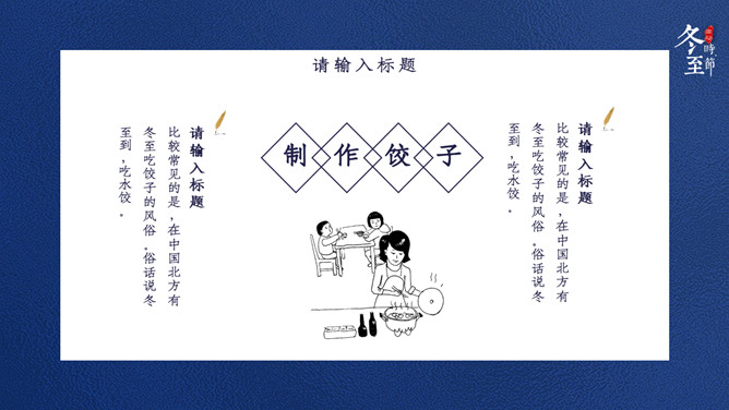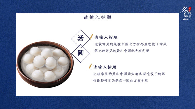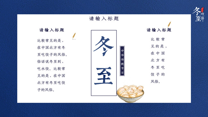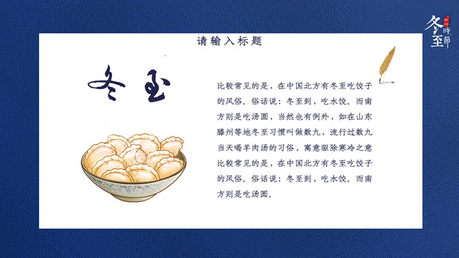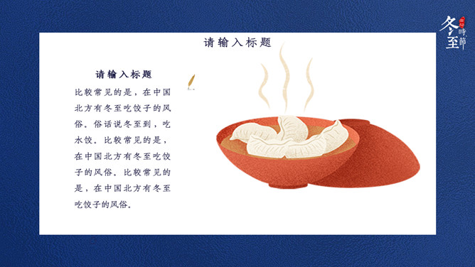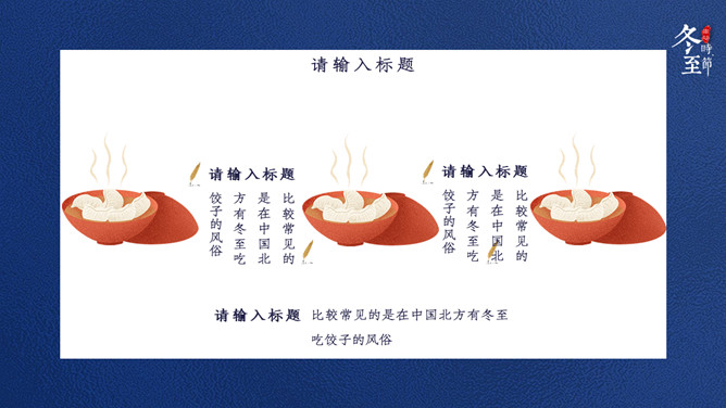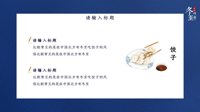 饺子筷子冬至节气PPT模板。比较常见的是,在中国北方有冬至吃饺子的风俗。俗话说:冬至到,吃水饺。而南方则是吃汤圆,当然也有例外,如在山东滕州等地冬至习惯叫做数九,流行过数九当天喝羊肉汤的习俗,寓意驱除寒冷之意比较常见的是,在中国北方有冬至吃饺子的风俗。俗话说:冬至到,吃水饺。而南方则是吃汤圆。