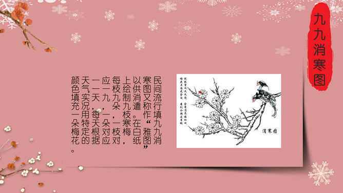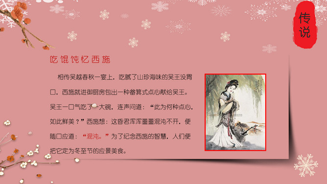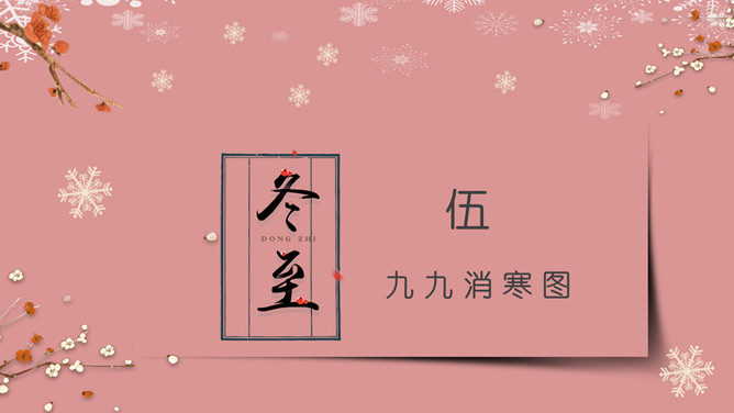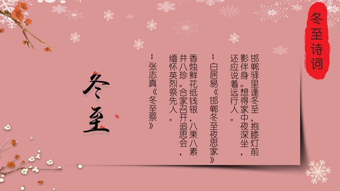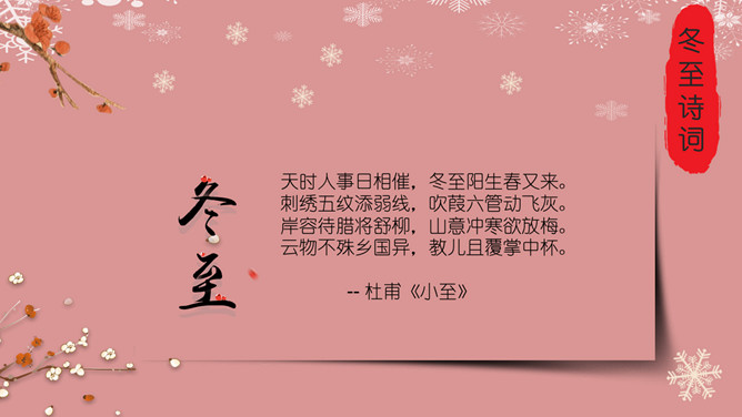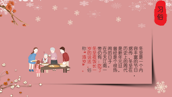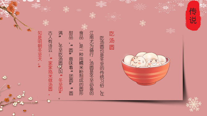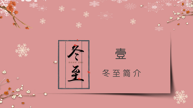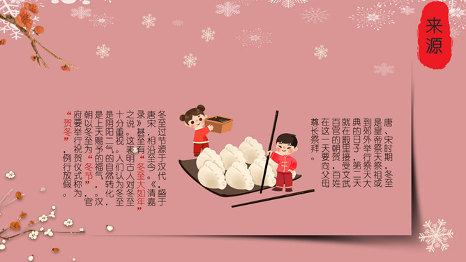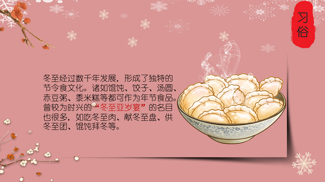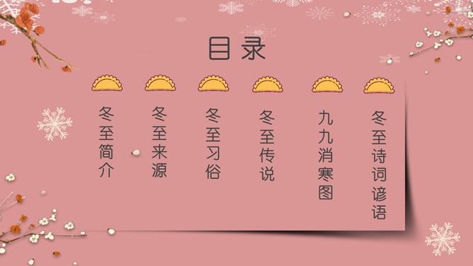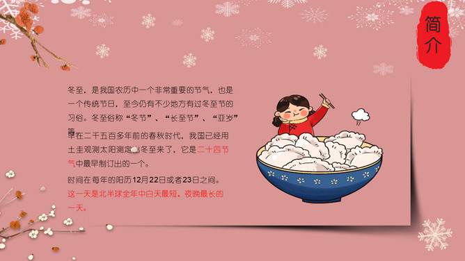 梅花饺子冬至节气PPT模板。冬至是一个内容丰富的节日,据传,冬至在历史上的周代是新年元旦,曾经是个很热闹的日子。 在今天江南一带仍有:吃了冬至夜饭长一岁的说法,俗称“添岁”。