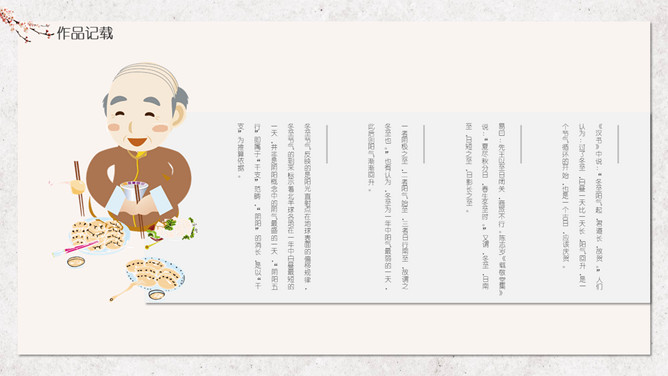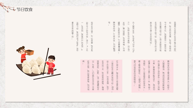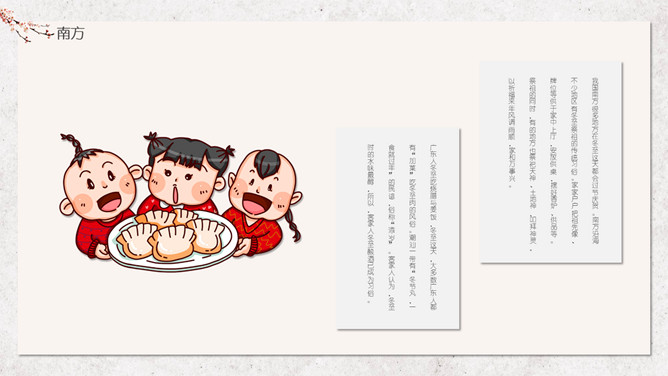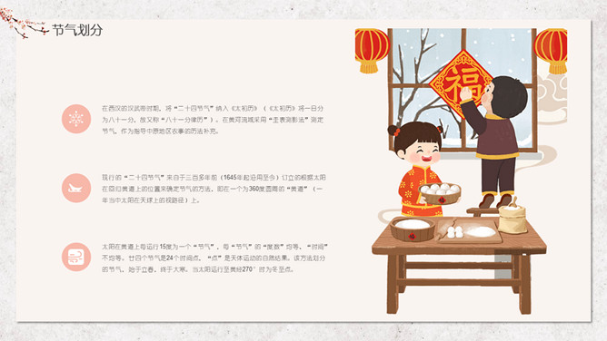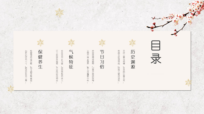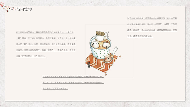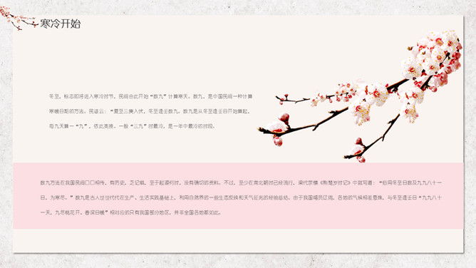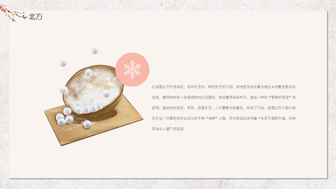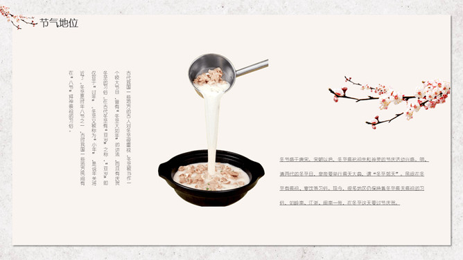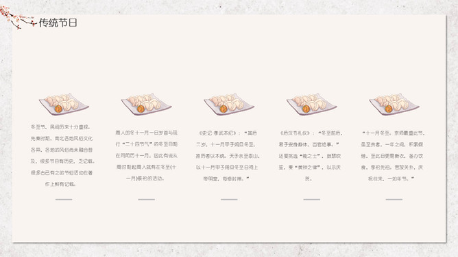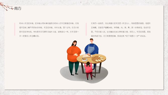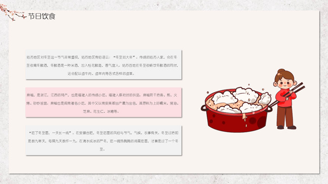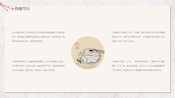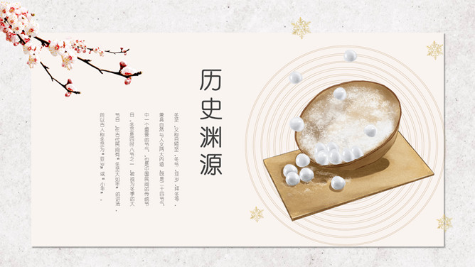 汤圆梅花冬至节气PPT模板。冬节盛于唐宋。宋朝以后,冬至祭祀祖先和神灵的节庆活动兴盛。明、清两代的冬至日,皇帝要举行祭天大典,谓“冬至郊天”。民间在冬至有祭祖、宴饮等习俗。现今,很多地区仍保持着冬至祭天祭祖的习俗,如岭南、江浙、闽南一带,在冬至这天要过节庆贺。