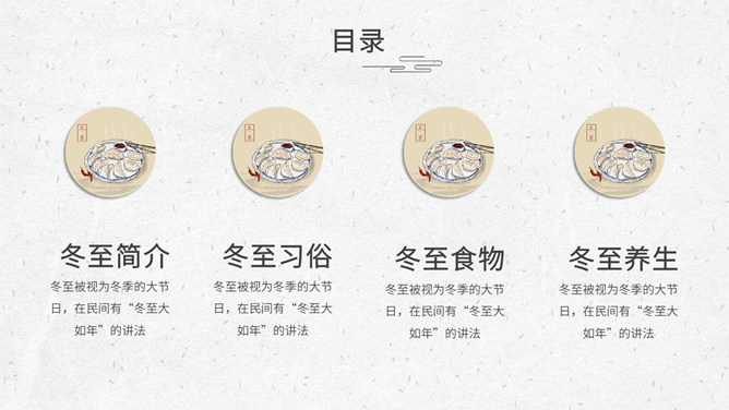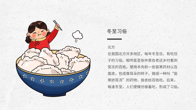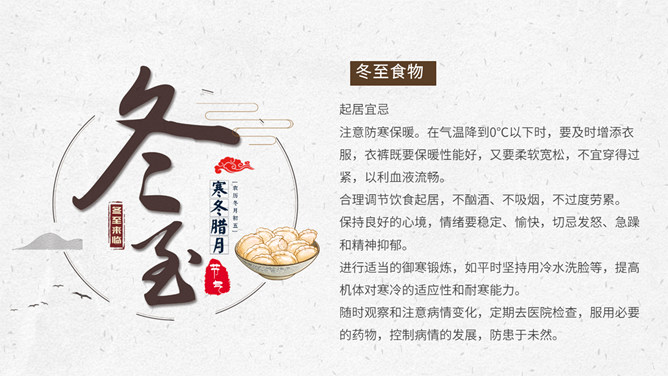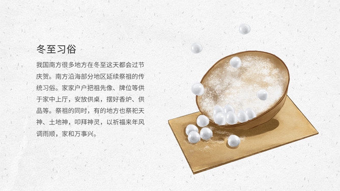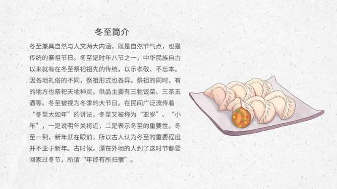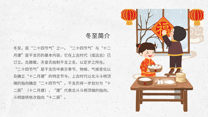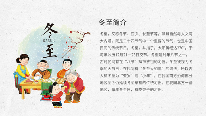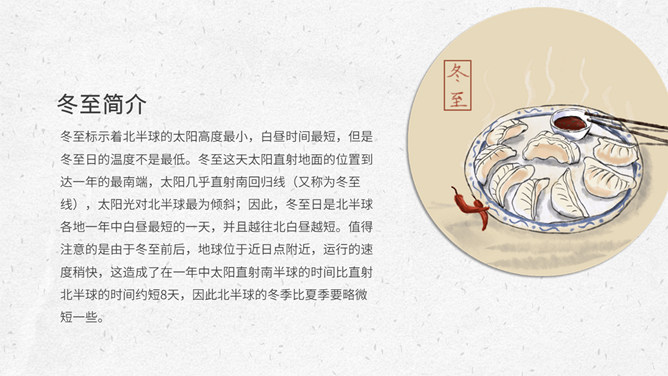 冬至标示着北半球的太阳高度最小,白昼时间最短,但是冬至日的温度不是最低。冬至这天太阳直射地面的位置到达一年的最南端,太阳几乎直射南回归线(又称为冬至线),太阳光对北半球最为倾斜;因此,冬至日是北半球各地一年中白昼最短的一天,并且越往北白昼越短。