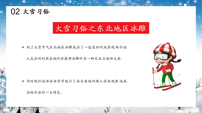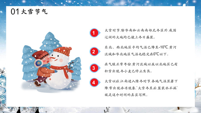 雪人小朋友大雪节气PPT模板。“大雪,十一月节,至此而雪盛也。“大雪的意思是天气更冷,降雪的可能性比小雪时更大了,并不指降雪量一定很大。