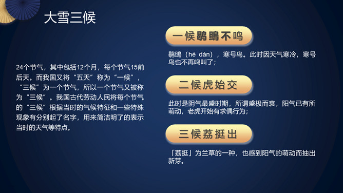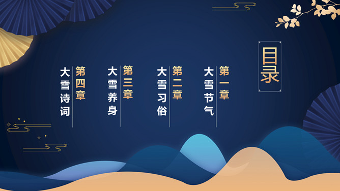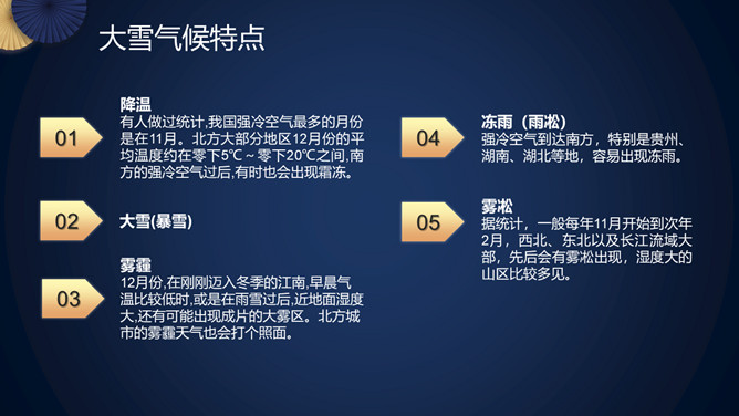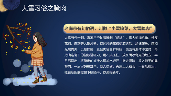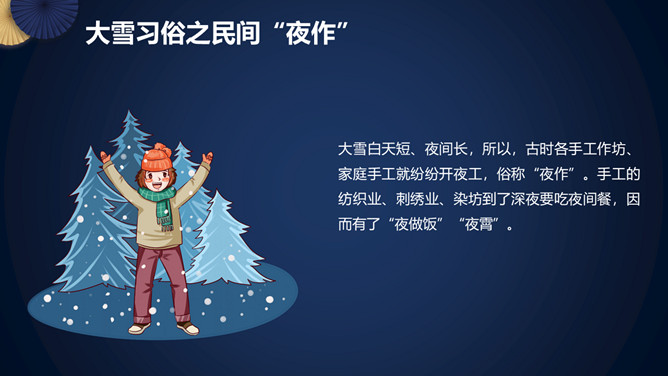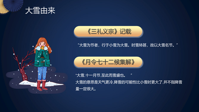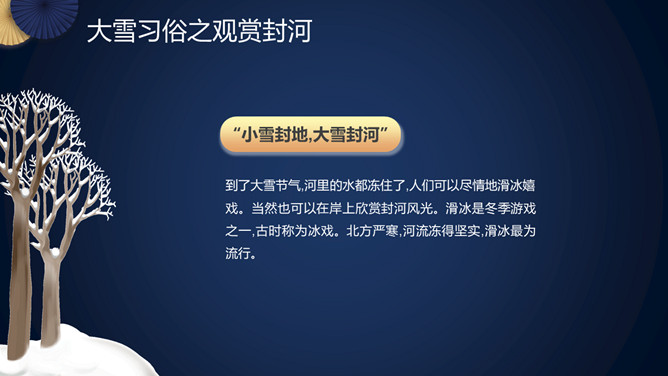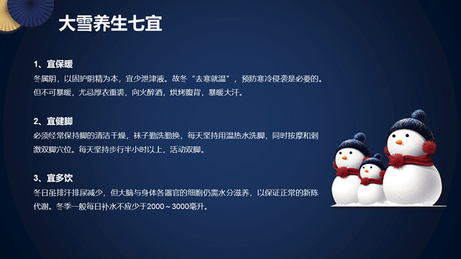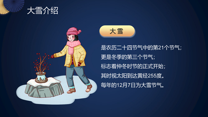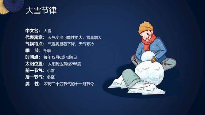 雪人大雪节气介绍PPT模板。大雪以后,江南进入隆冬时节,各地气温显著下降,常出现冰冻现象,“大雪冬至后,篮装水不漏”就是这个时间的真实写照。