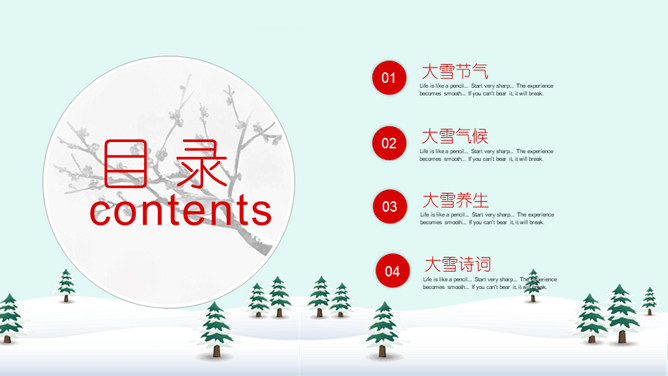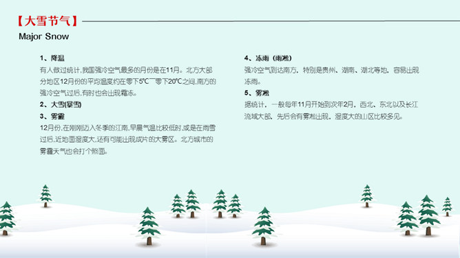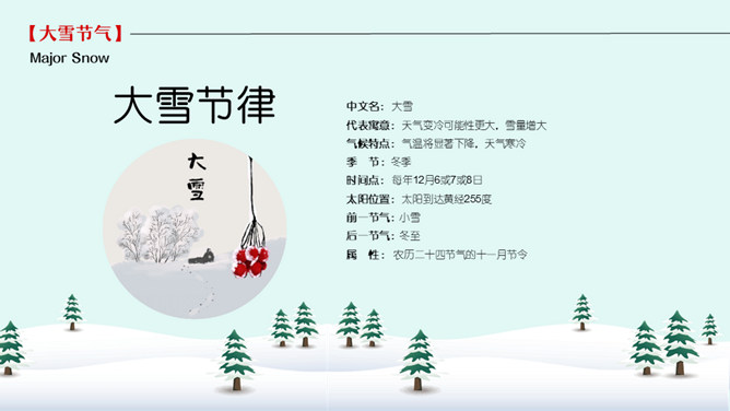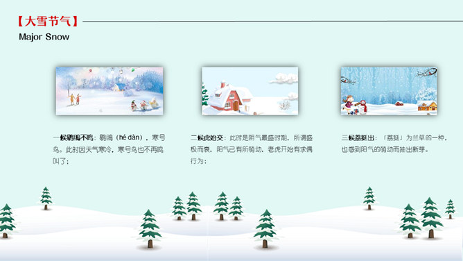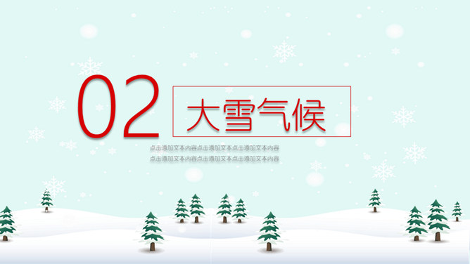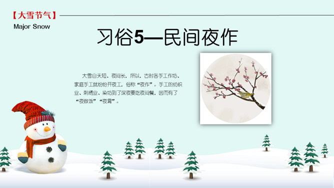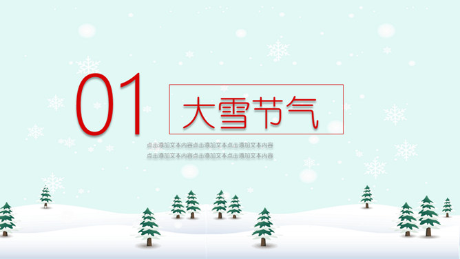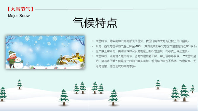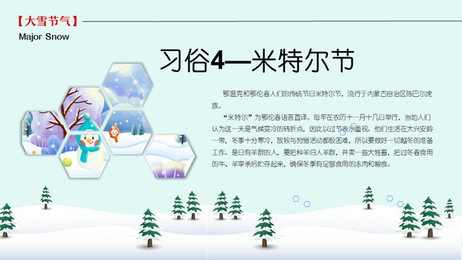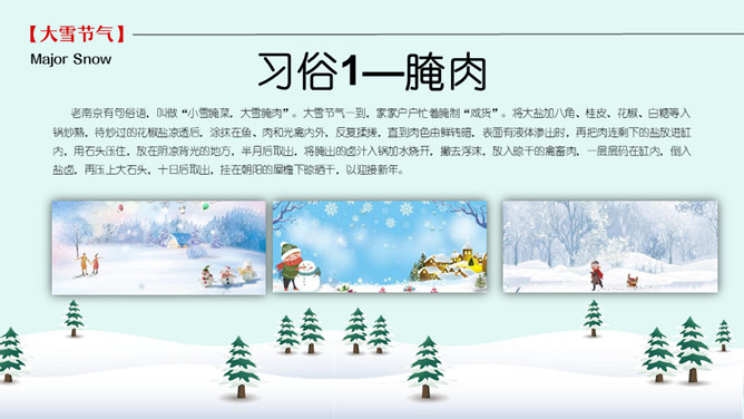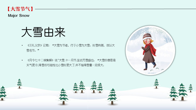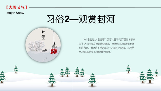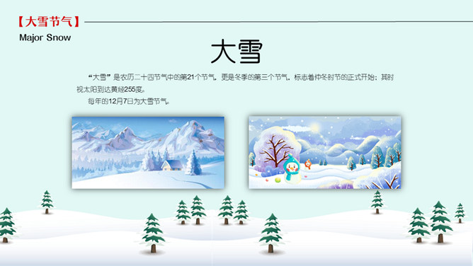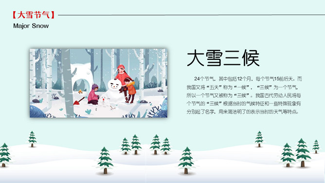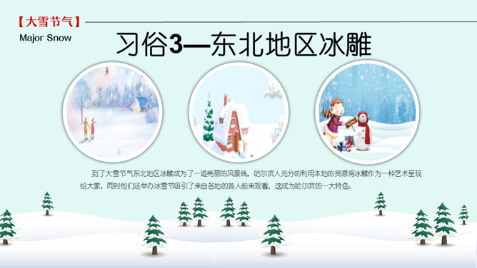 雪人松树大雪节气PPT模板。到了大雪节气东北地区冰雕成为了一道亮丽的风景线,哈尔滨人充分的利用本地的资源将冰雕作为一种艺术呈现给大家,同时他们还举办冰雪节吸引了来自各地的游人前来观看,这成为哈尔滨的一大特色。