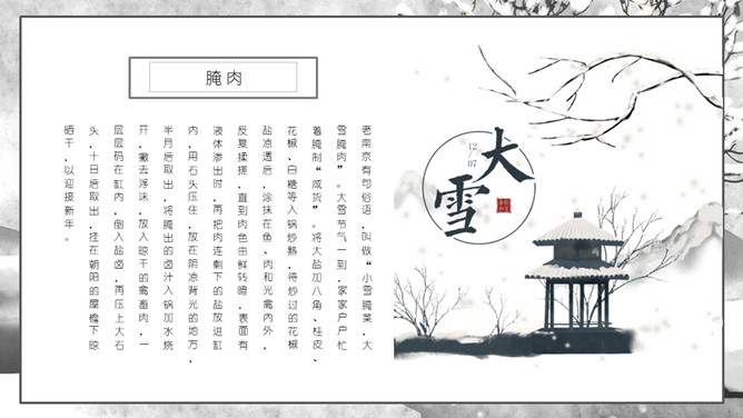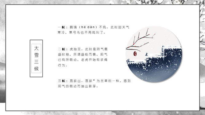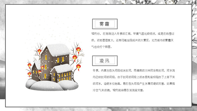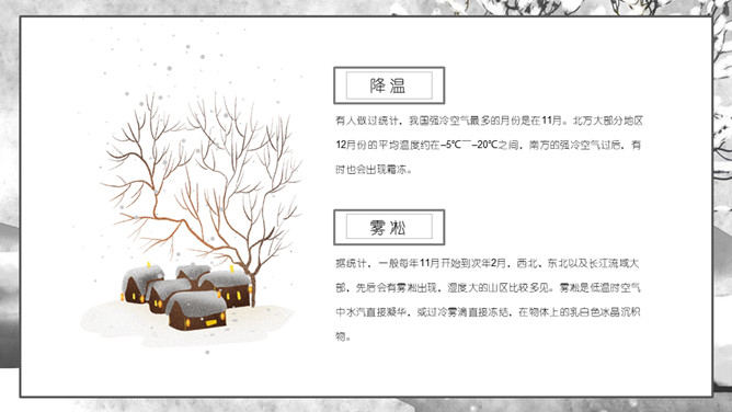 枯树小房子大雪节气PPT模板。大雪是二十四节气之一,也是我国农历的重要时间节点,关于这些重要的时间节点会有很多的文人墨客都会写东西来表达他们的思绪,诗歌就是其中的一种。