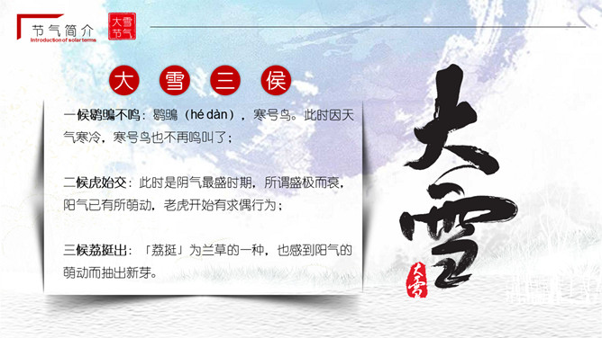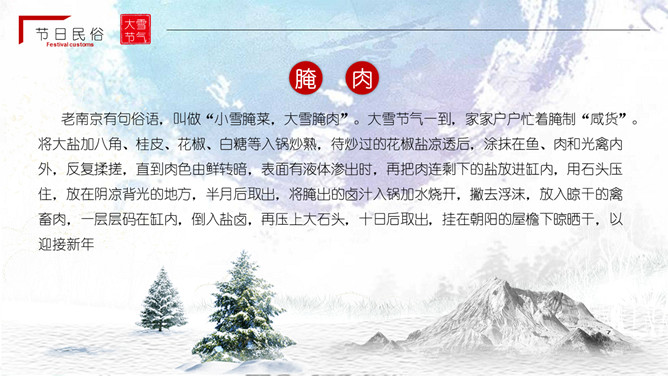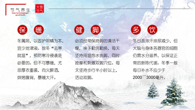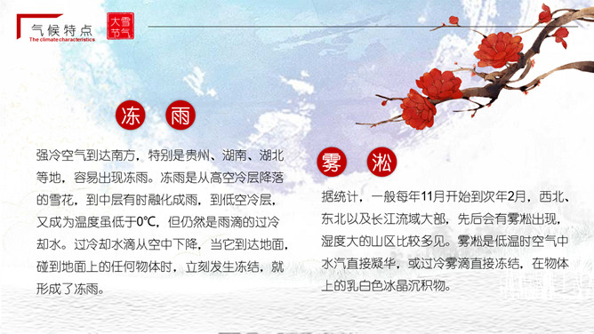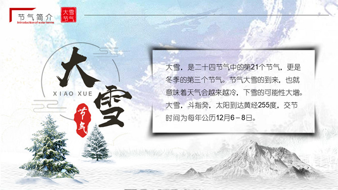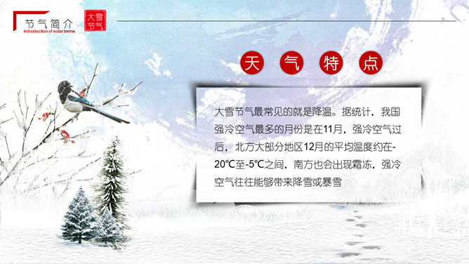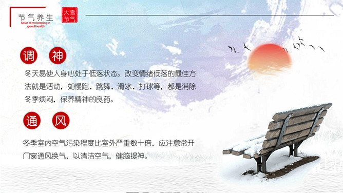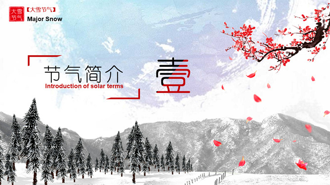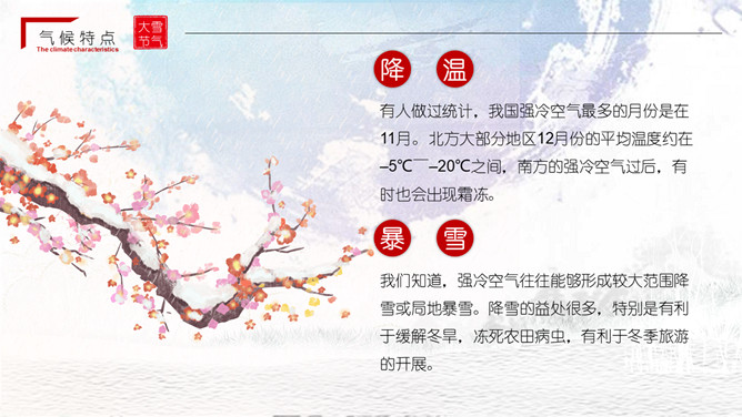 梅花松树大雪节气PPT模板。冬天易使人身心处于低落状态。改变情绪低落的最佳方法就是活动,如慢跑、跳舞、滑冰、打球等,都是消除冬季烦闷,保养精神的良药。