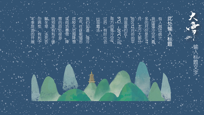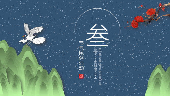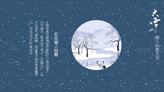 山峰仙鹤大雪节气PPT模板。常说,“瑞雪兆丰年”。严冬积雪覆盖大地,保持地面及作物周围的温度不会因寒流侵袭而降得很低,冬作物创造了良好的越冬环境。积雪融化时又增加了土壤水分含量,供作物春季生长的需要。