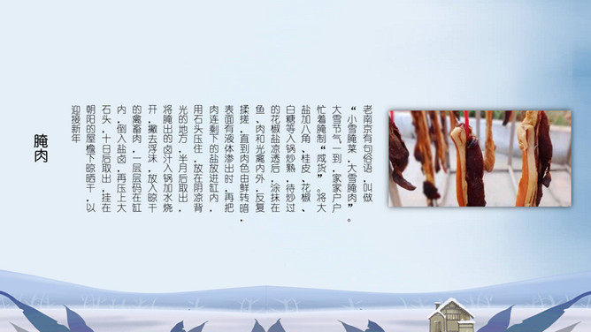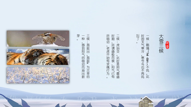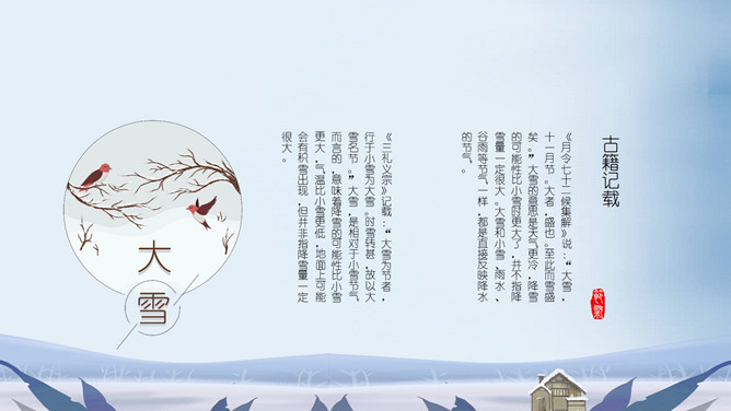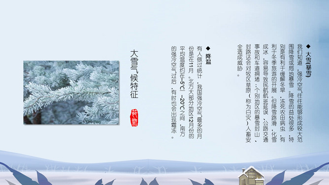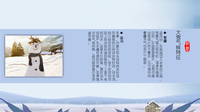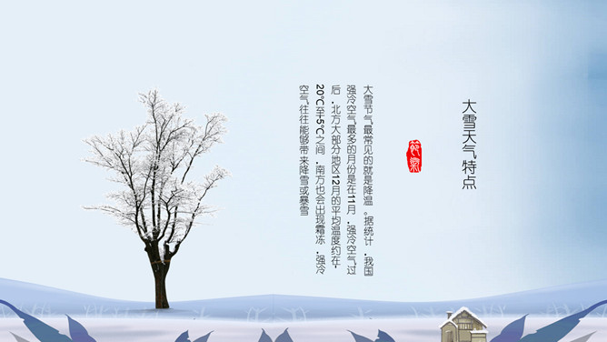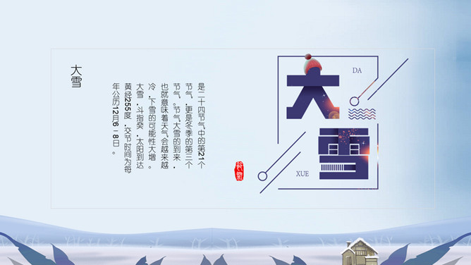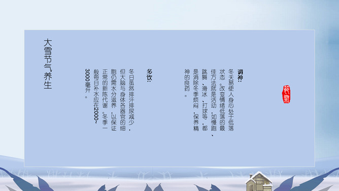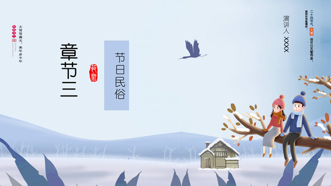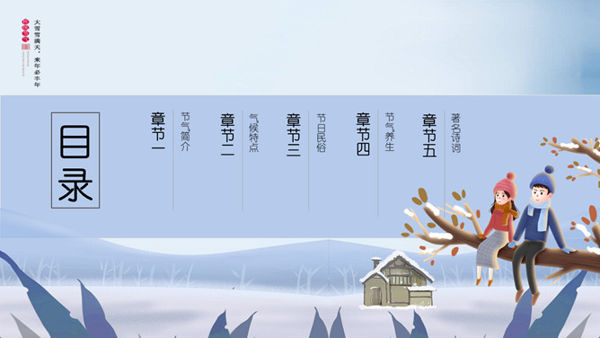 情侣大雪节气主题PPT模板。冬季室内空气污染程度比室外严重数十倍,应注意常开门窗通风换气,以清洁空气,健脑提神。