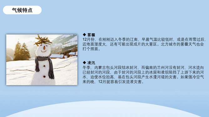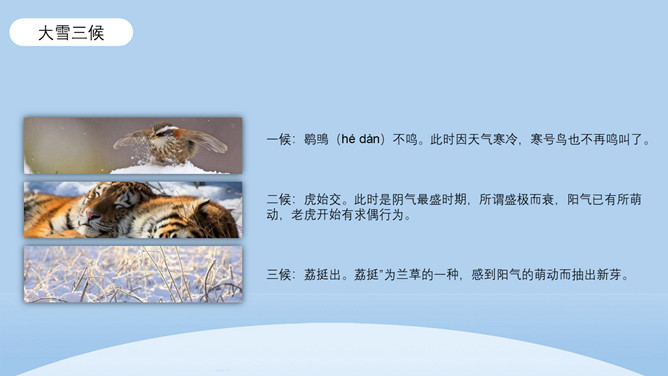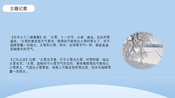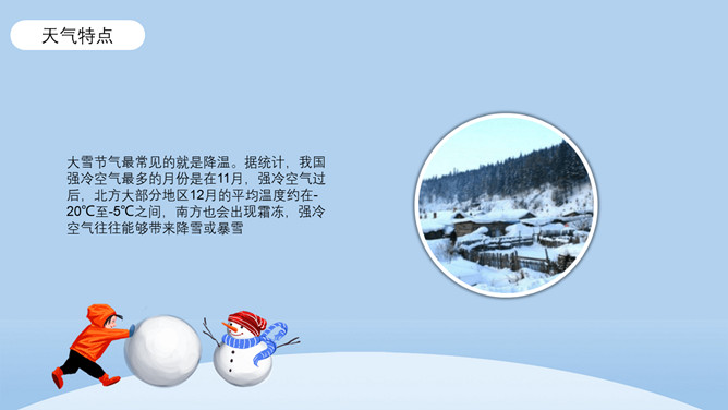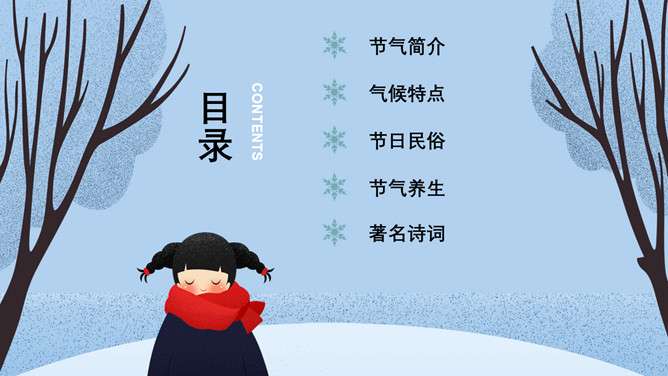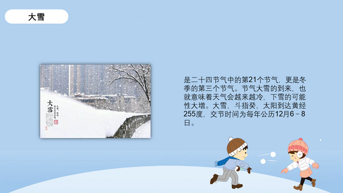 女孩大雪节气介绍PPT模板。《三礼义宗》记载:“大雪为节者,行于小雪为大雪。时雪转甚,故以大雪名节。”大雪,是相对于小雪节气而言的,意味着降雪的可能性比小雪更大,气温比小雪更低,地面上可能会有积雪出现,但并非指降雪量一定很大。