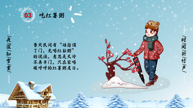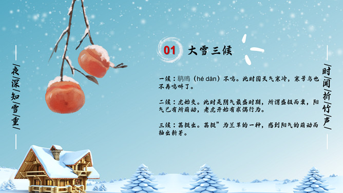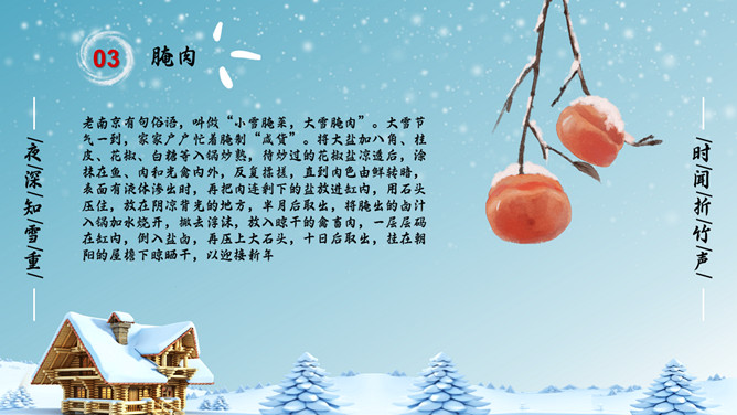 老南京有句俗语,叫做“小雪腌菜,大雪腌肉”。大雪节气一到,家家户户忙着腌制“咸货”。将大盐加八角、桂皮、花椒、白糖等入锅炒熟,待炒过的花椒盐凉透后,涂抹在鱼、肉和光禽内外,反复揉搓,直到肉色由鲜转暗,表面有液体渗出时,再把肉连剩下的盐放进缸内,用石头压住,放在阴凉背光的地方,半月后取出,将腌出的卤汁入锅加水烧开,撇去浮沫,放入晾干的禽畜肉,一层层码在缸内,倒入盐卤,再压上大石头,十日后取出,挂在朝阳的屋檐下晾晒干,以迎接新年。
