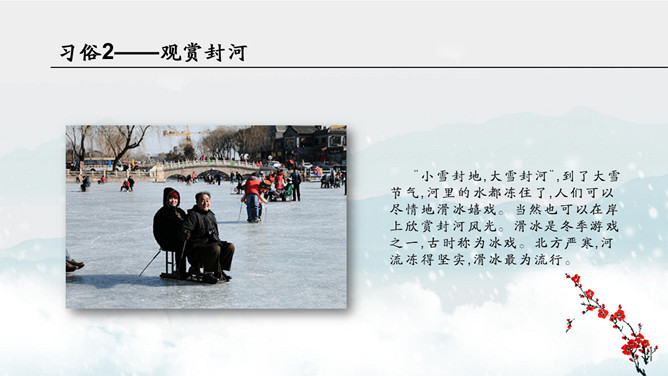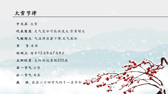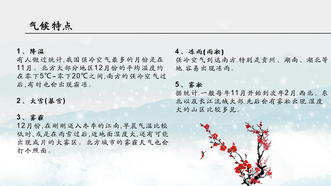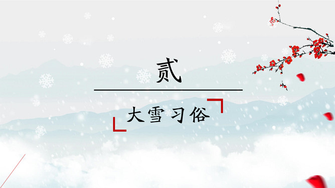 红梅飘雪大雪节气PPT模板。防跌倒:“下雪天,防滑、防跌、防撞对老人来说最重要。”建议骨质疏松的老人下雪天最好不要出门。防中风:对于血管弹性差的人,气温急剧变化会带来血压波动,引发中风。