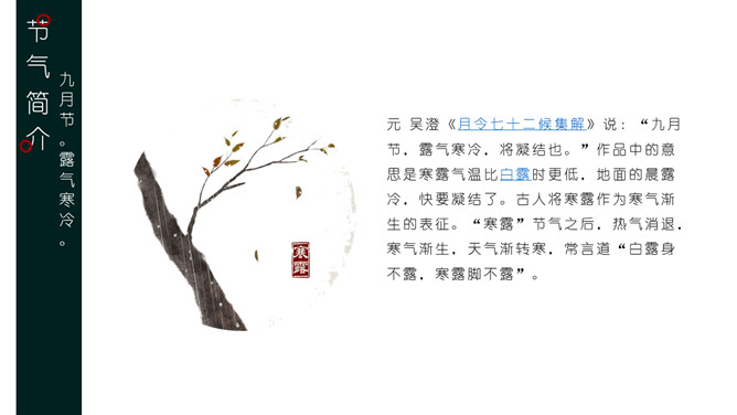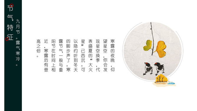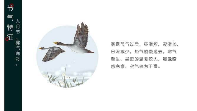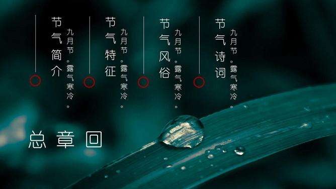 叶子露珠寒露节气PPT模板。寒露节气过后,昼渐短,夜渐长,日照减少,热气慢慢退去,寒气渐生,昼夜的温差较大,晨晚略感寒意,空气较为干燥。