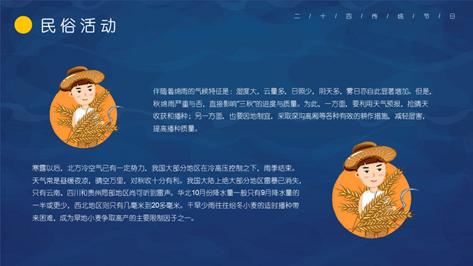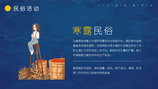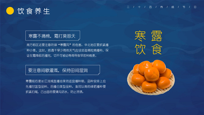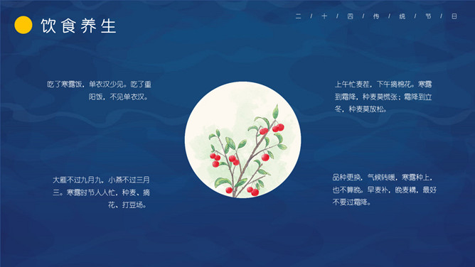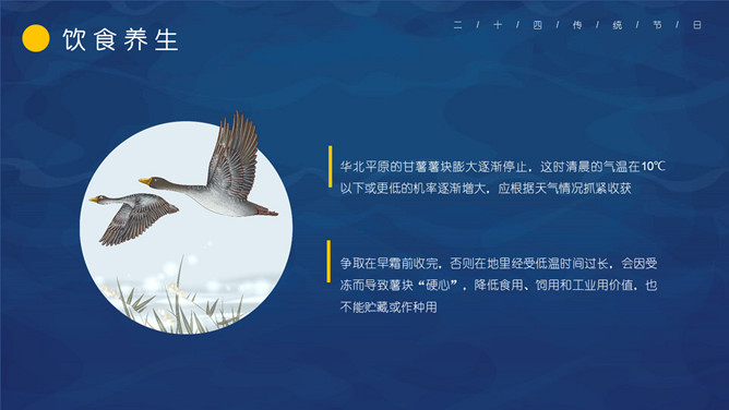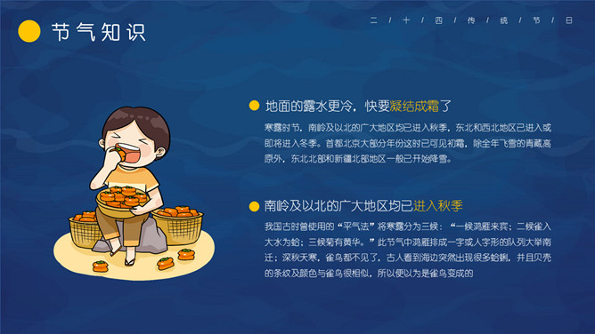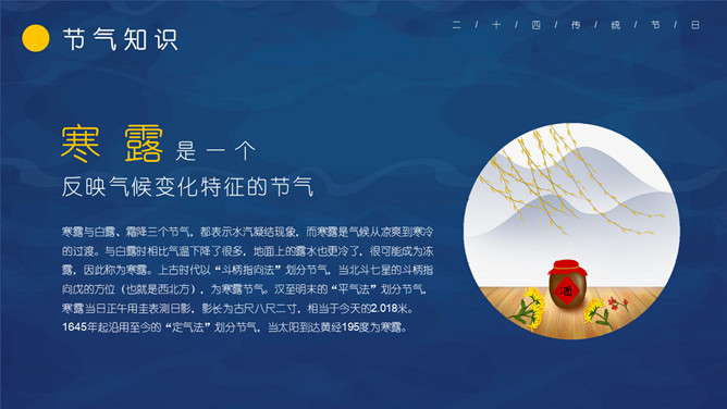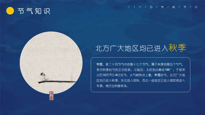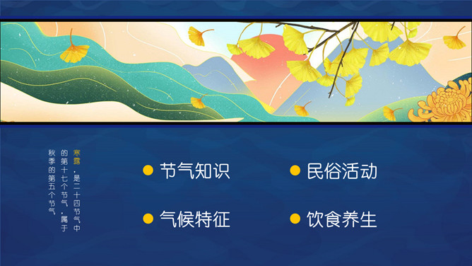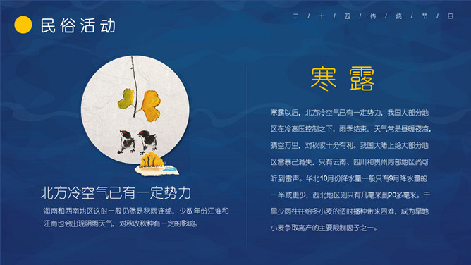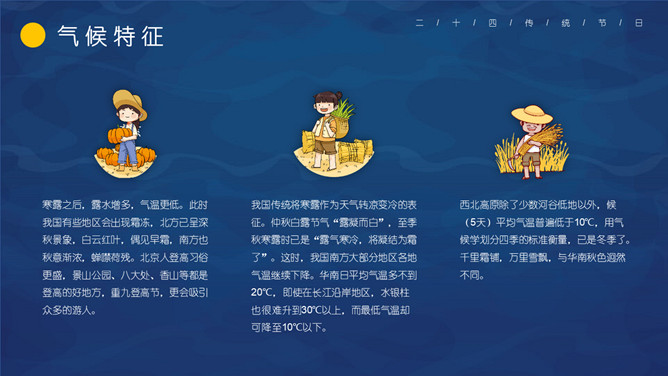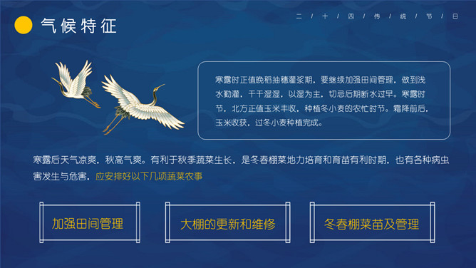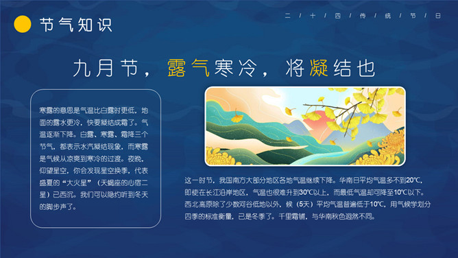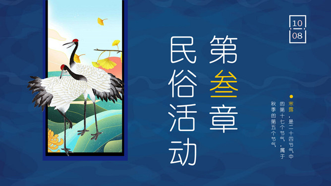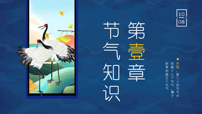 仙鹤寒露节气主题PPT模板。这一时节,我国南方大部分地区各地气温继续下降。华南日平均气温多不到20℃,即使在长江沿岸地区,气温也很难升到30℃以上,而最低气温却可降至10℃以下。西北高原除了少数河谷低地以外,候(5天)平均气温普遍低于10℃,用气候学划分四季的标准衡量,已是冬季了。千里霜铺,与华南秋色迥然不同。