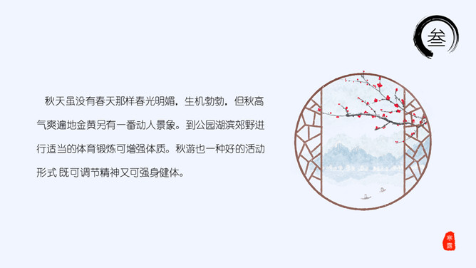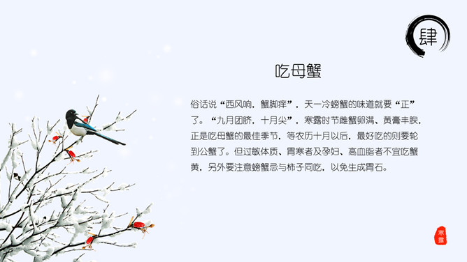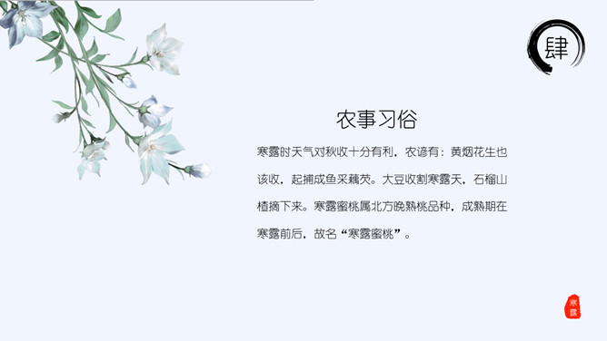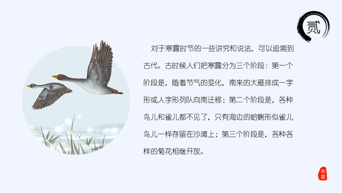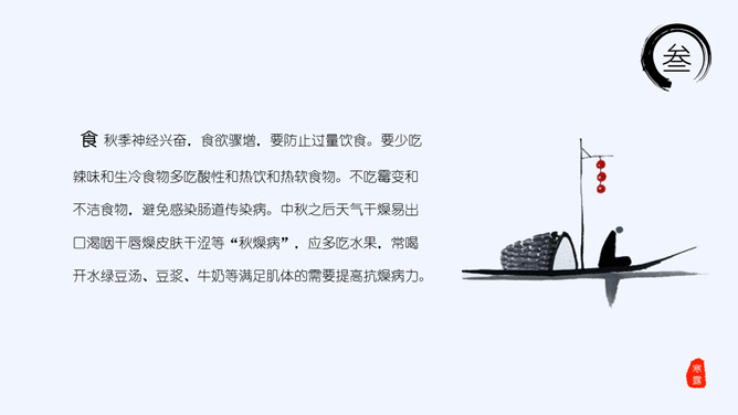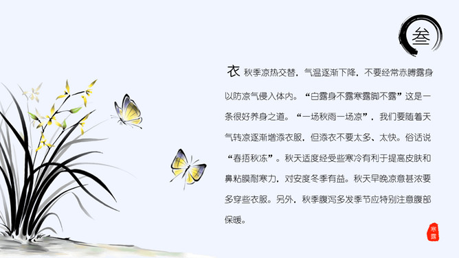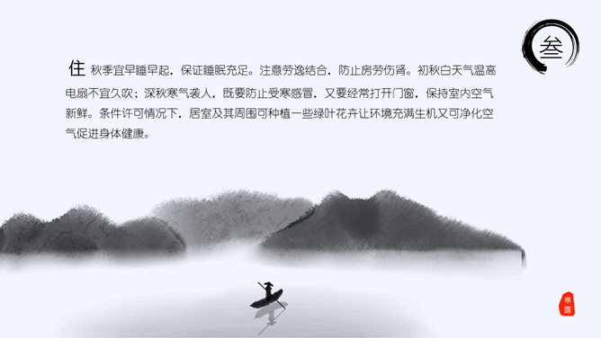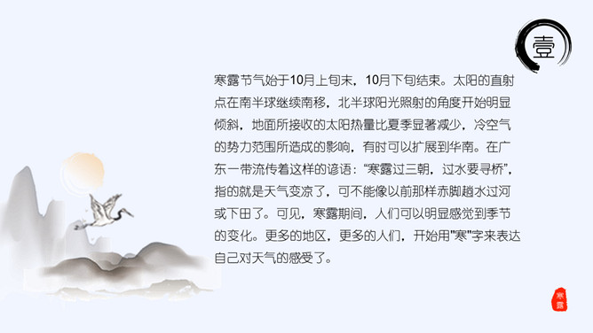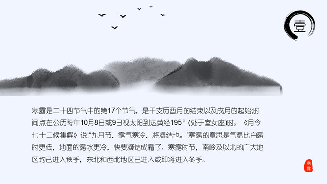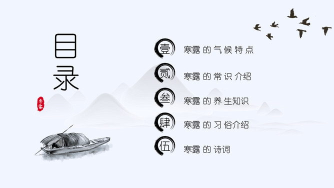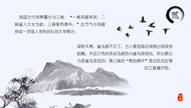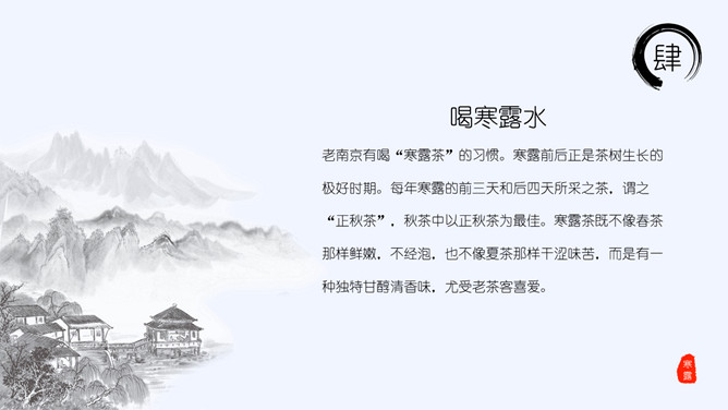山峰孤舟寒露节气PPT模板。老南京有喝“寒露茶”的习惯。寒露前后正是茶树生长的极好时期。每年寒露的前三天和后四天所采之茶,谓之“正秋茶”,秋茶中以正秋茶为最佳。寒露茶既不像春茶那样鲜嫩,不经泡,也不像夏茶那样干涩味苦,而是有一种独特甘醇清香味,尤受老茶客喜爱。