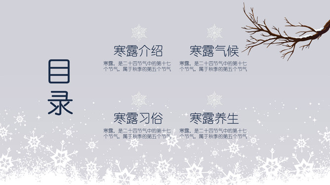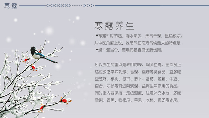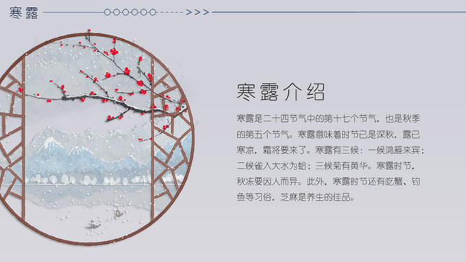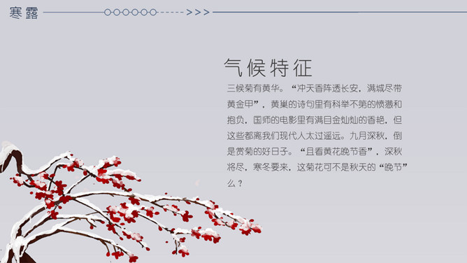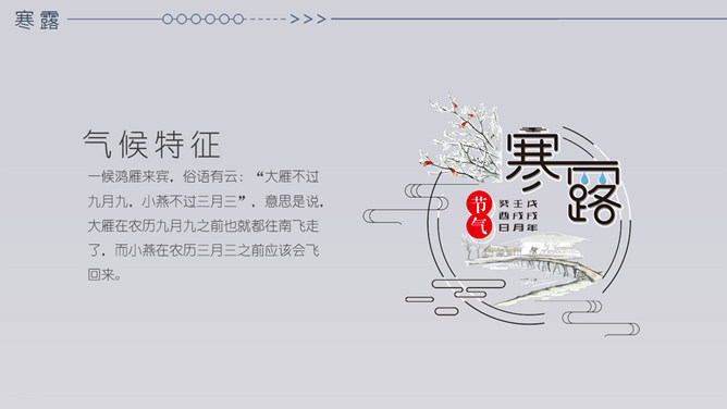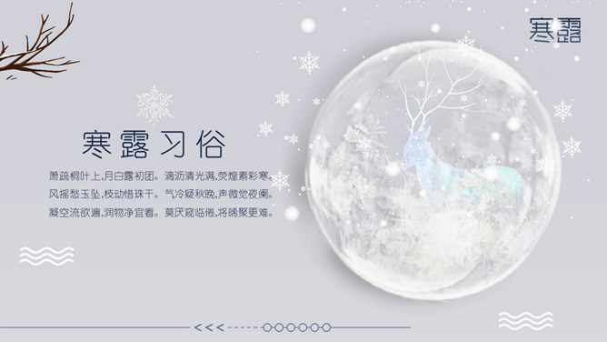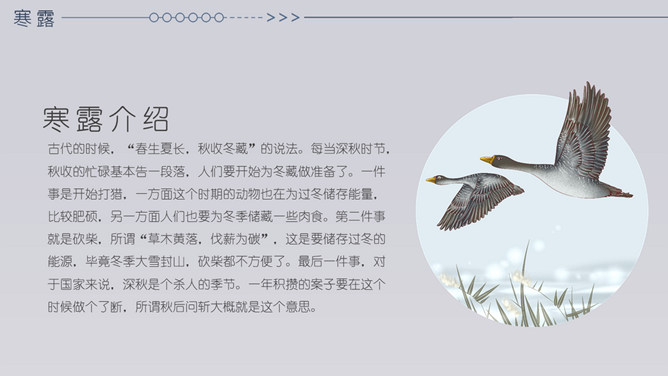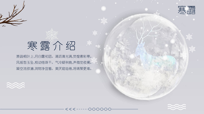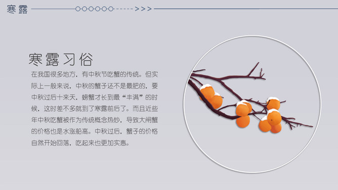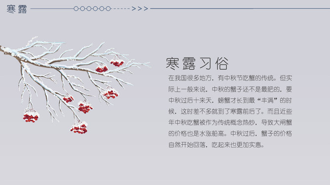 小鹿寒露节气主题PPT模板。在我国很多地方,有中秋节吃蟹的传统。但实际上一般来说,中秋的蟹子还不是最肥的,要中秋过后十来天,螃蟹才长到最“丰满”的时候,这时差不多就到了寒露前后了。而且近些年中秋吃蟹被作为传统概念热炒,导致大闸蟹的价格也是水涨船高。中秋过后,蟹子的价格自然开始回落,吃起来也更加实惠。