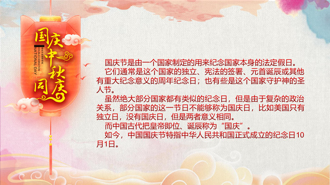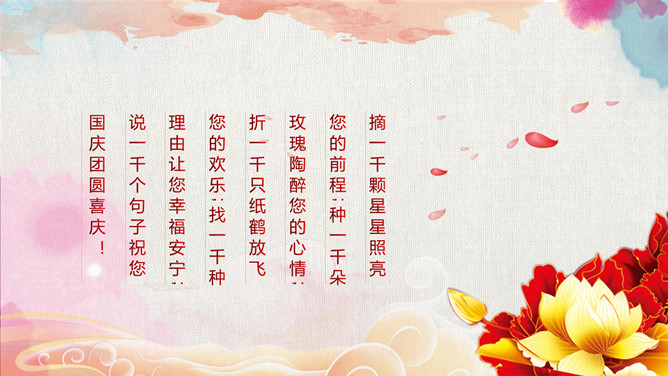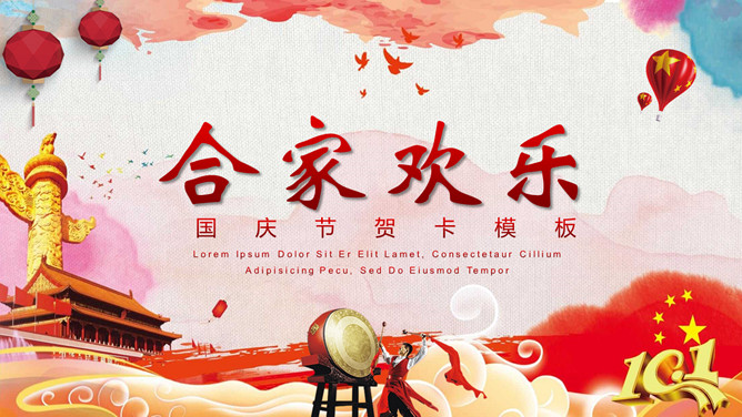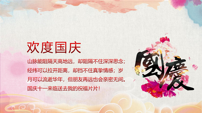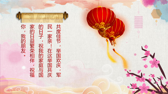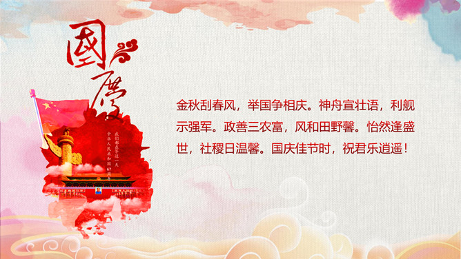 喜迎国庆节介绍PPT模板下载。共度佳节,举国欢庆,军民一家亲!在这举国共庆的日子,祝我的家庭与国家的日益繁荣相伴,祝福你,我的朋友。
