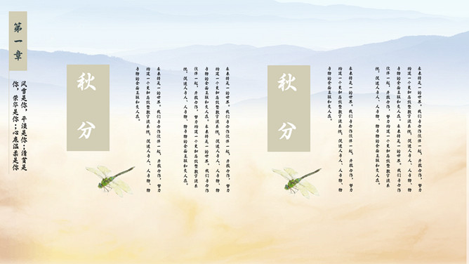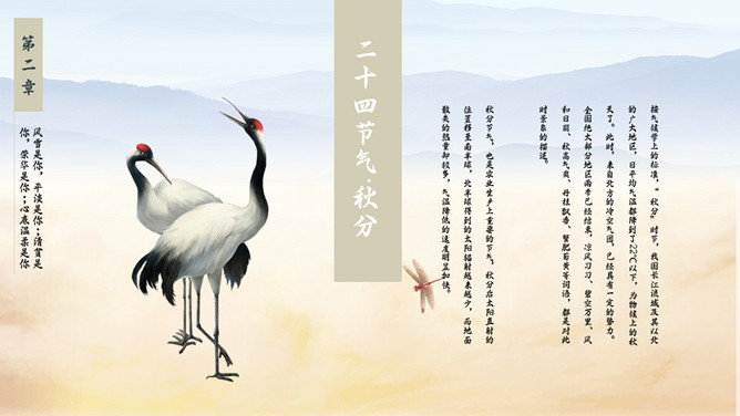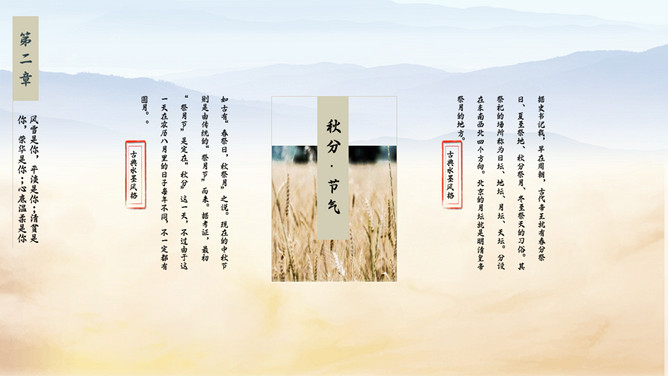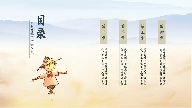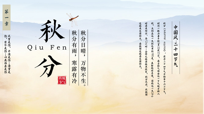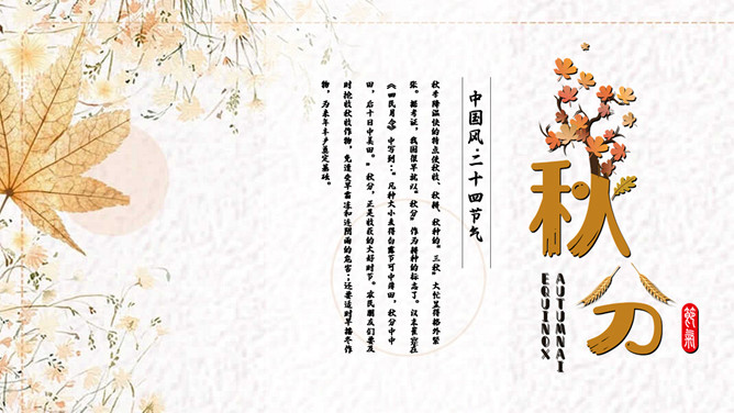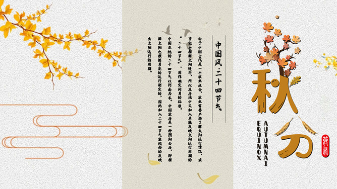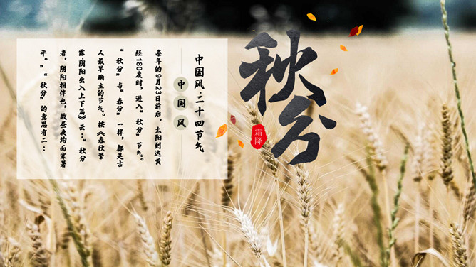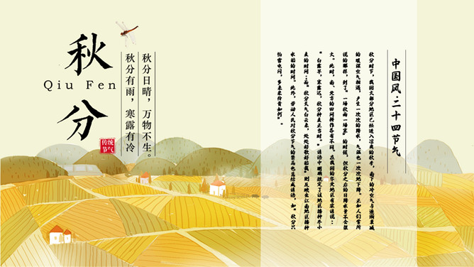 麦田稻草人秋分节气PPT模板。秋分(autumnal equinox),农历二十四节气中的第十六个节气,时间一般为每年的9月22或23日。南方的气候由这一节气起才始入秋。太阳在这一天到达黄经180度,直射地球赤道,因此这一天24小时昼夜均分,各12小时;全球无极昼极夜现象。秋分之后,北极附近极夜范围渐大,南极附近极昼范围渐大。