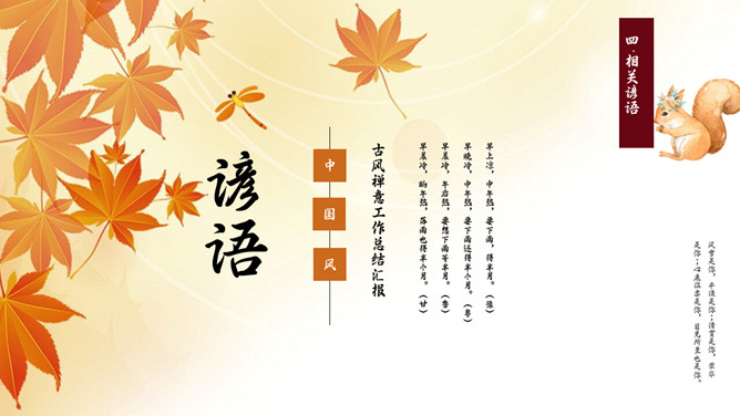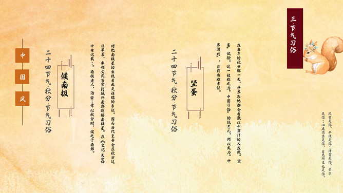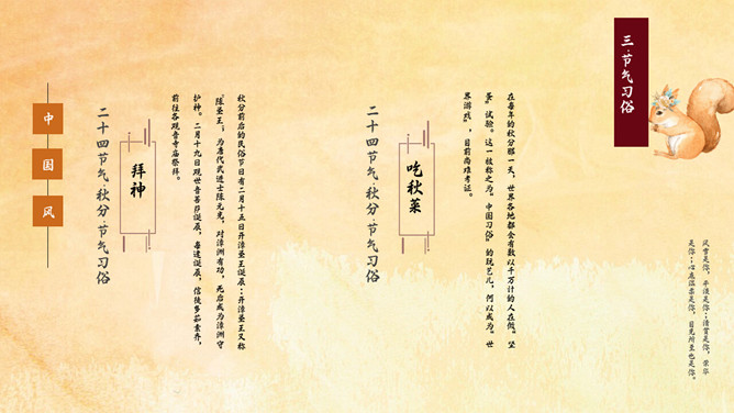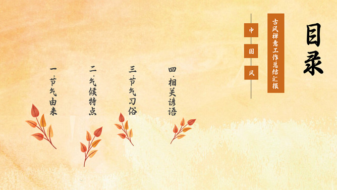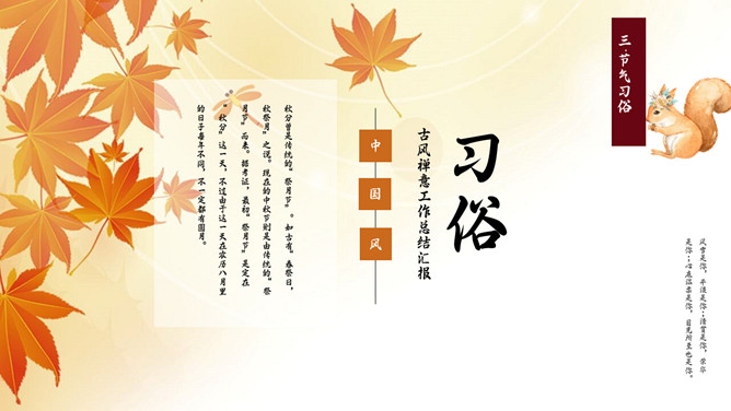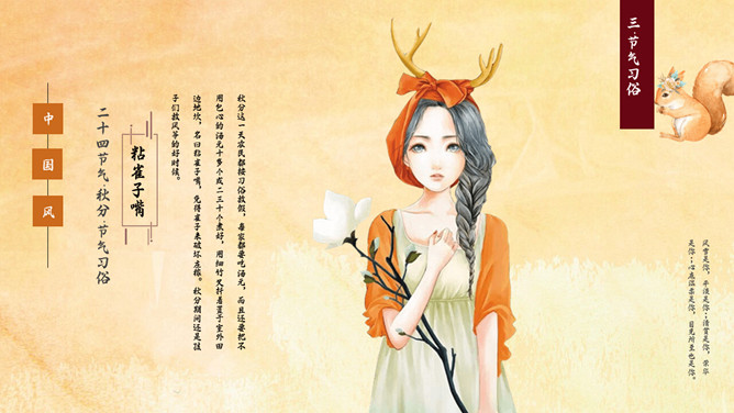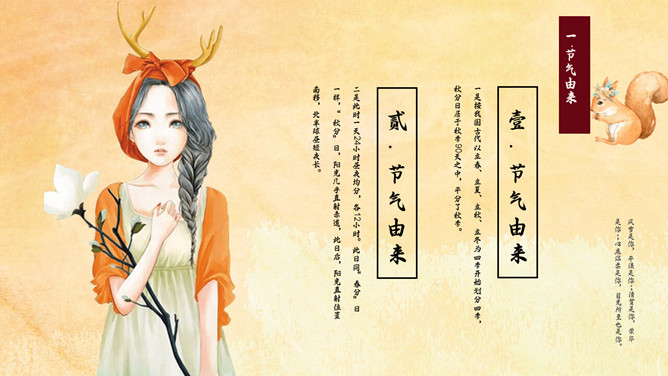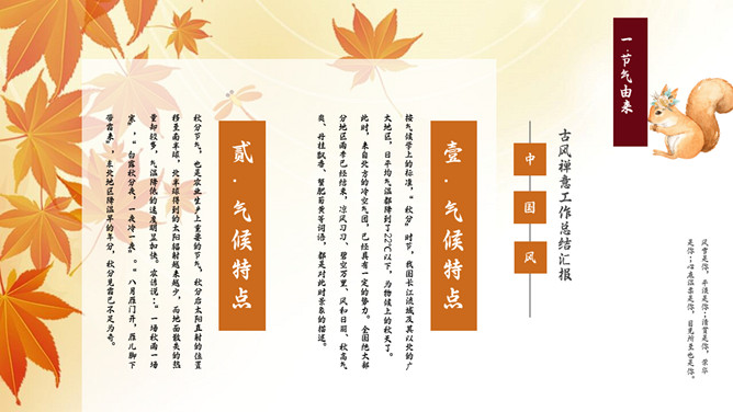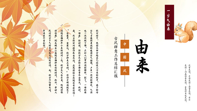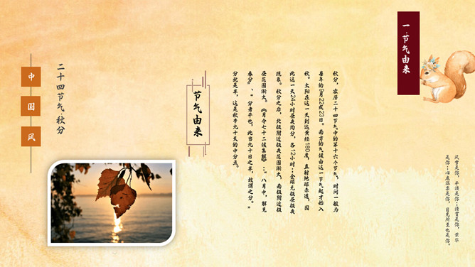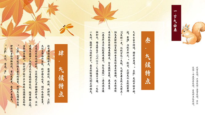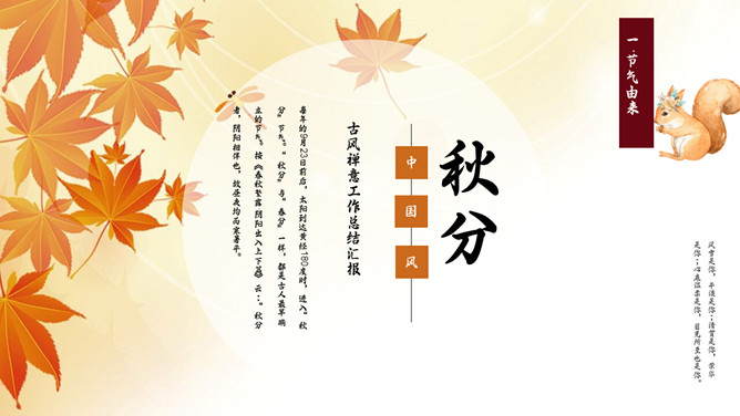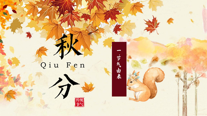 枫叶秋分节气主题PPT模板。秋分时节,我国大部分地区已经进入凉爽的秋季,南下的冷空气与逐渐衰减的暖湿空气相遇,产生一次次的降水,气温也一次次地下降。正如人们常所说的那样,到了“一场秋雨一场寒”的时候,但秋分之后的日降水量不会很大。