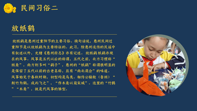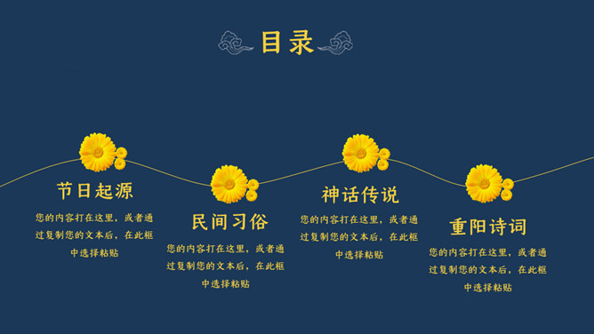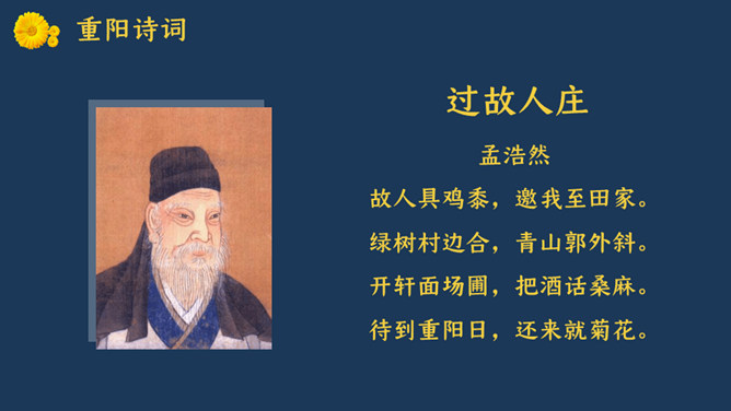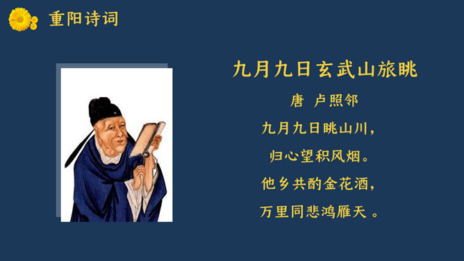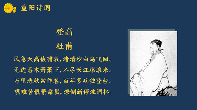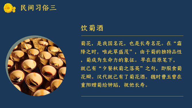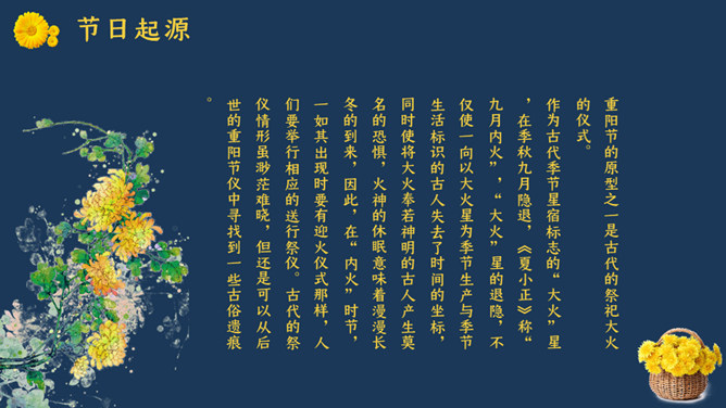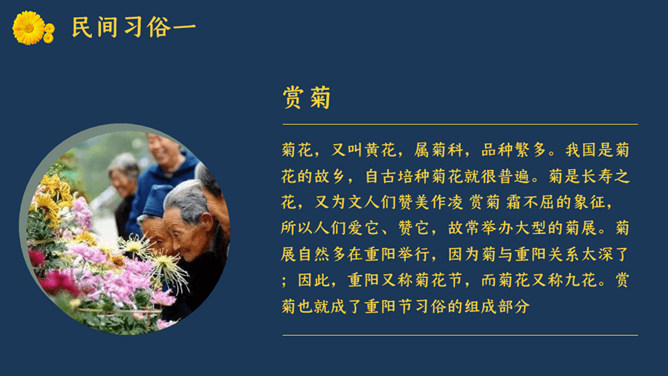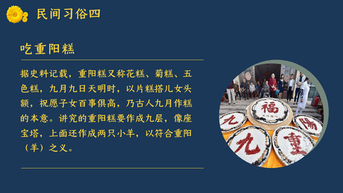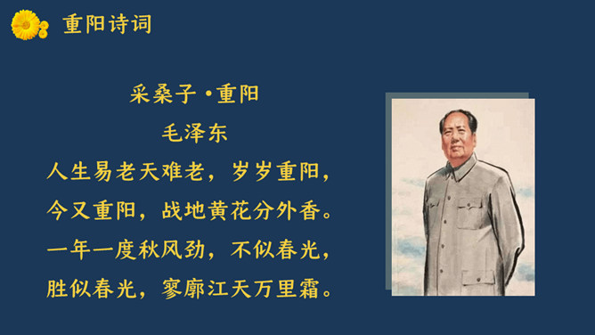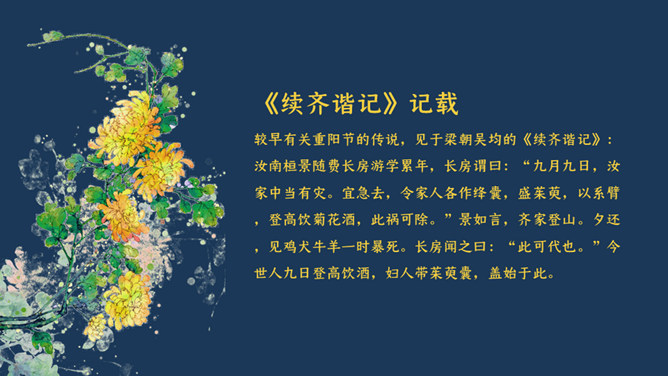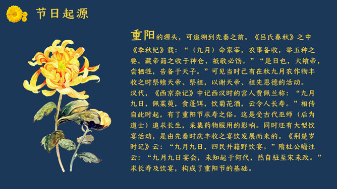 登高重阳节浓浓敬老情PPT模板。重阳的源头,可追溯到先秦之前。《吕氏春秋》之中《季秋纪》载:“(九月)命家宰,农事备收,举五种之要。藏帝籍之收于神仓,祗敬必饬。”“是日也,大飨帝,尝牺牲,告备于天子。”可见当时已有在秋九月农作物丰收之时祭飨天帝、祭祖,以谢天帝、祖先恩德的活动。