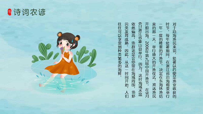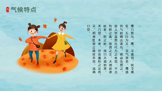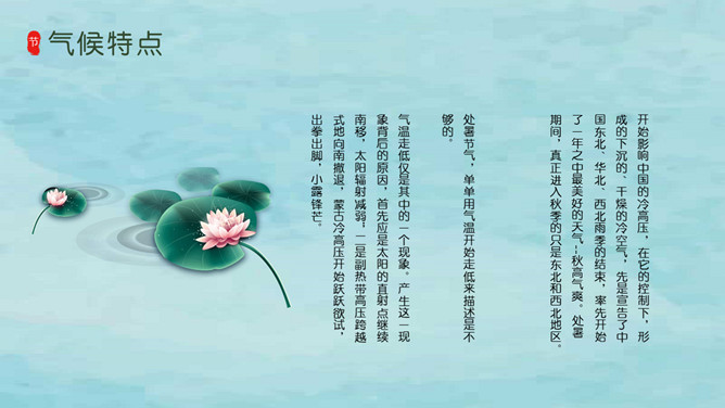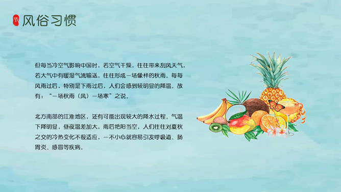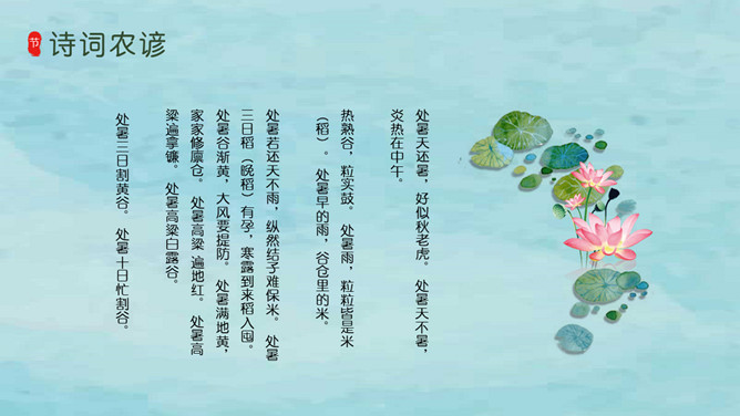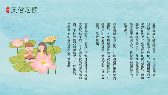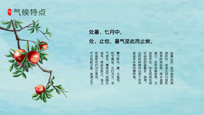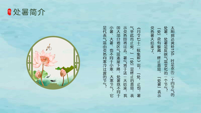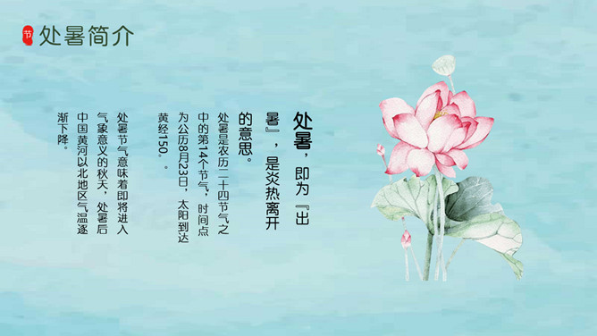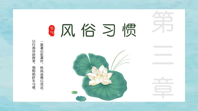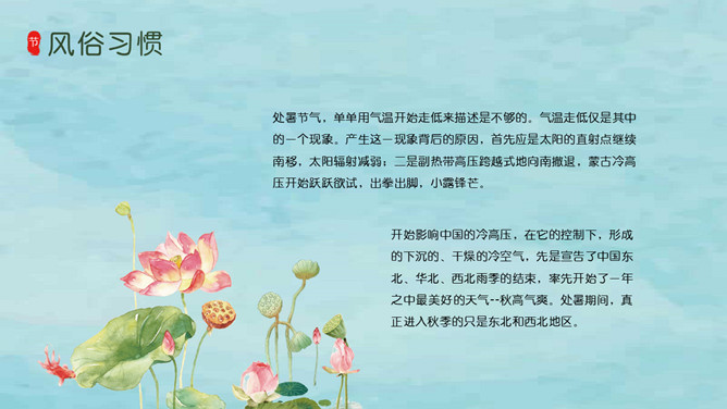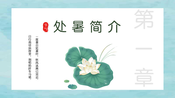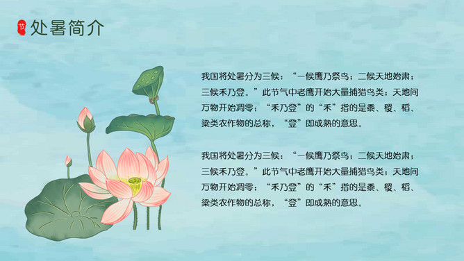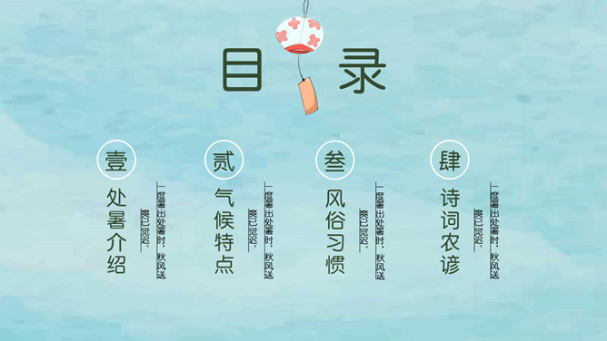 风铃蜻蜓处暑节气PPT模板。我国将处暑分为三候:“一候鹰乃祭鸟;二候天地始肃;三候禾乃登。”此节气中老鹰开始大量捕猎鸟类;天地间万物开始凋零;“禾乃登”的“禾”指的是黍、稷、稻、粱类农作物的总称,“登”即成熟的意思。