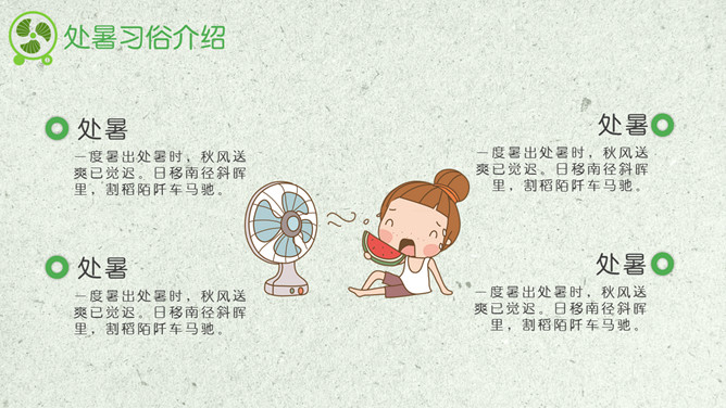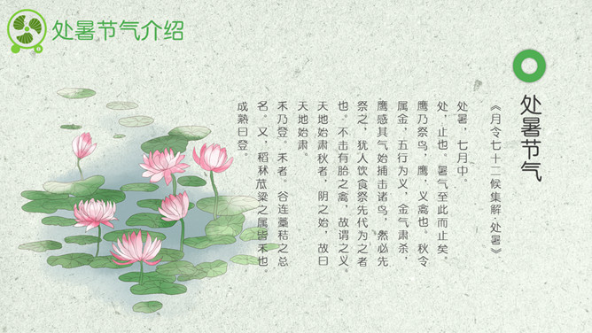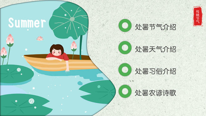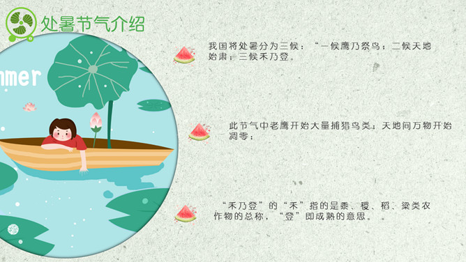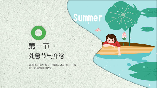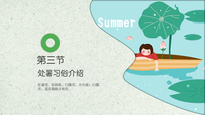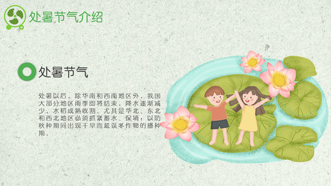 荷花划船处暑节气PPT模板。处暑以后,除华南和西南地区外,我国大部分地区雨季即将结束,降水逐渐减少,水稻成熟收割。尤其是华北、东北和西北地区必须抓紧蓄水、保墒;以防秋种期间出现干旱而延误冬作物的播种期。