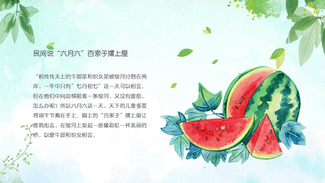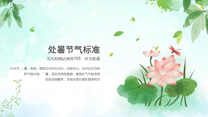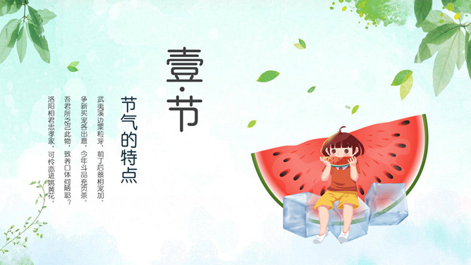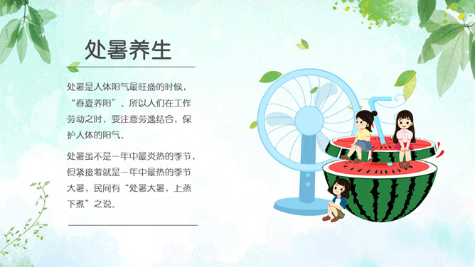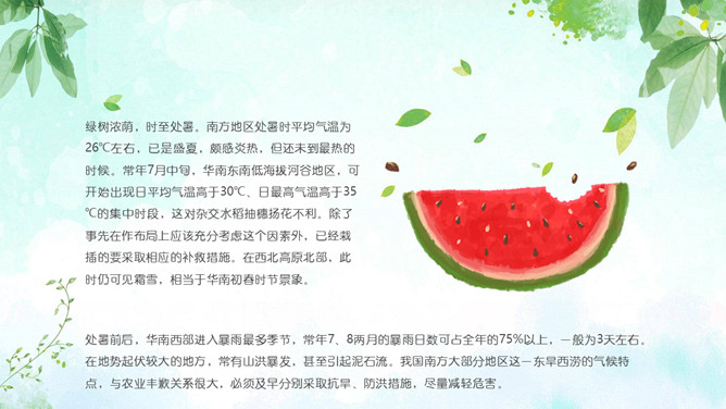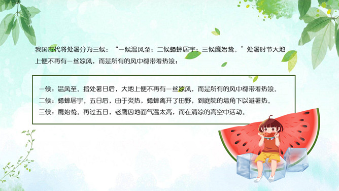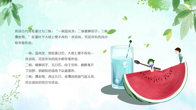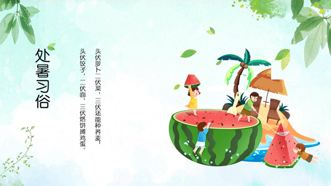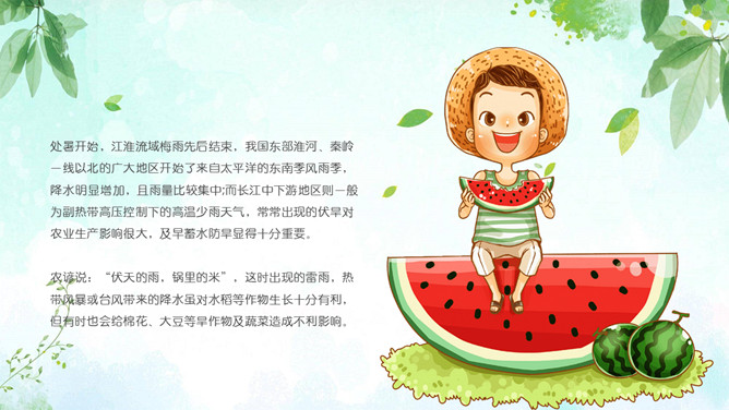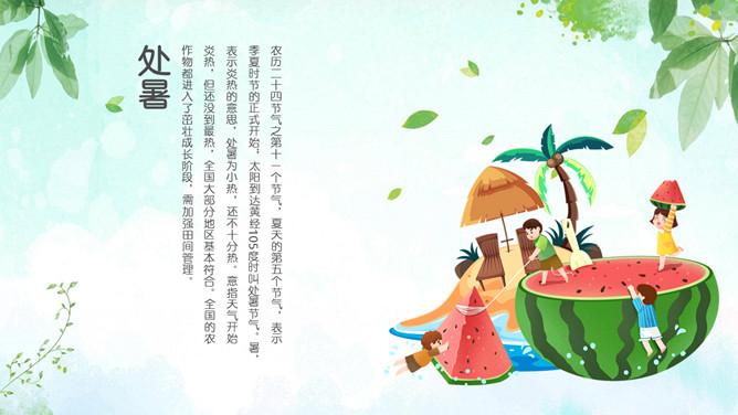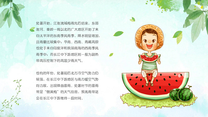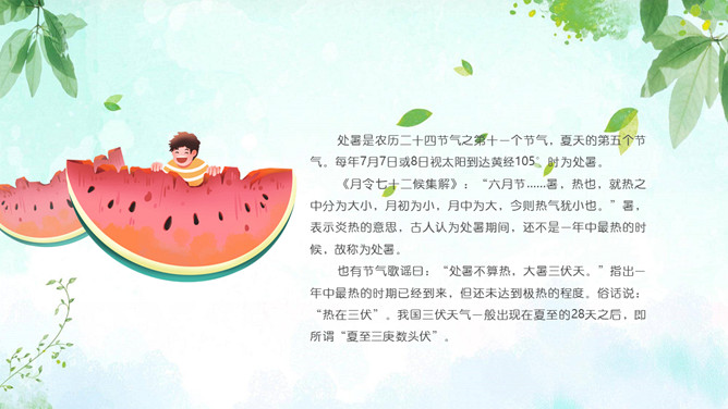 小孩吃西瓜处暑节气PPT模板。有节气歌谣曰:“处暑不算热,大暑三伏天。”指出一年中最热的时期已经到来,但还未达到极热的程度。俗话说:“热在三伏”。我国三伏天气一般出现在夏至的28天之后,即所谓“夏至三庚数头伏”。