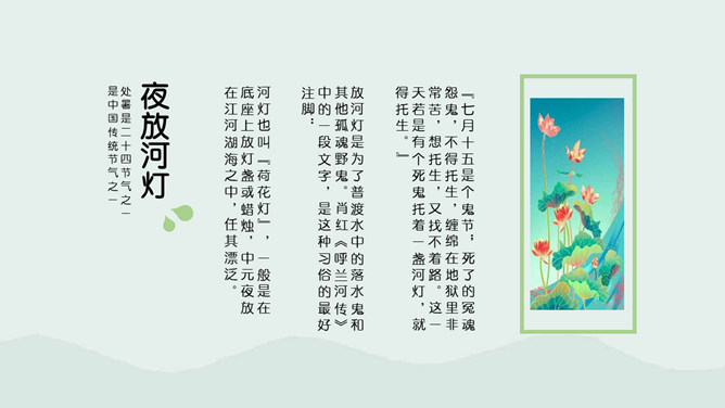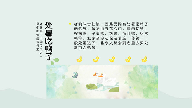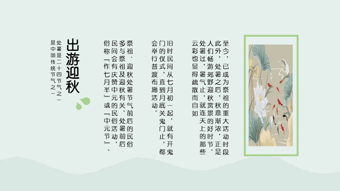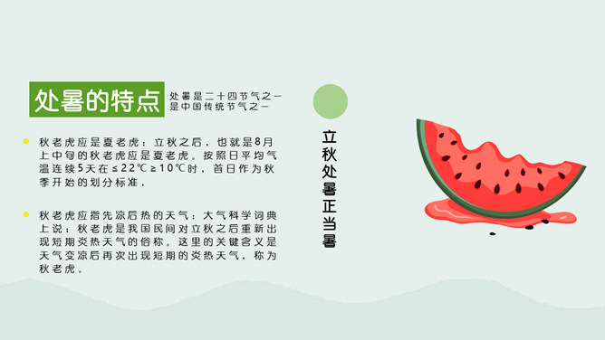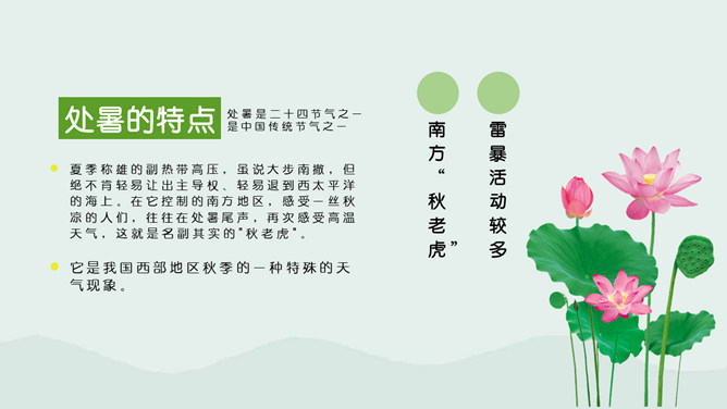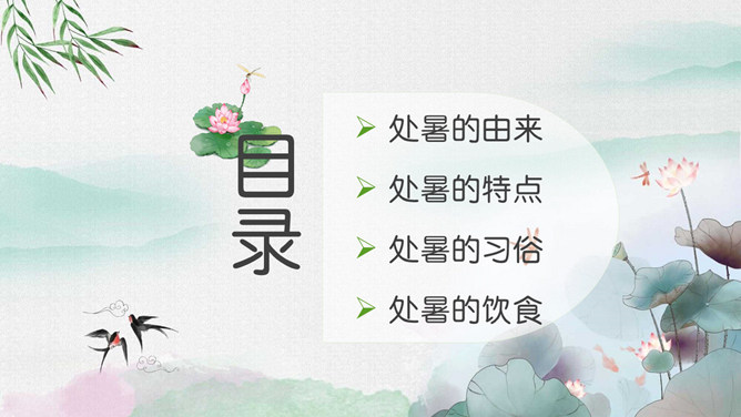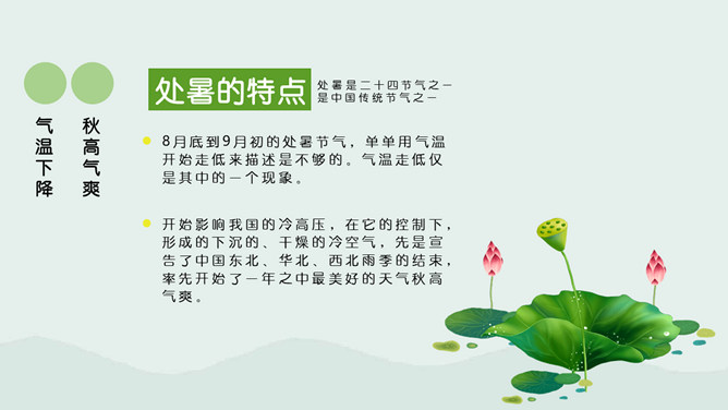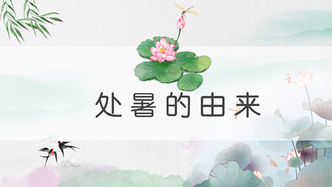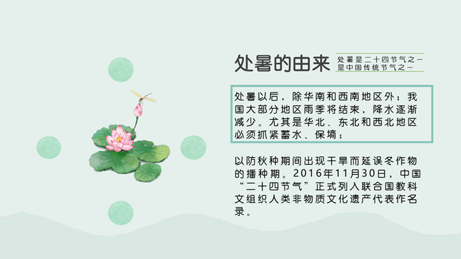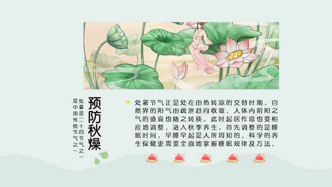 荷花蜻蜓处暑节气PPT模板。处暑节气正是处在由热转凉的交替时期,自然界的阳气由疏泄趋向收敛,人体内阴阳之气的盛衰也随之转换,此时起居作息也要相应地调整。进入秋季养生,首先调整的是睡眠时间,早睡早起是人所周知的。科学的养生保健更需要全面地掌握睡眠规律及方法。