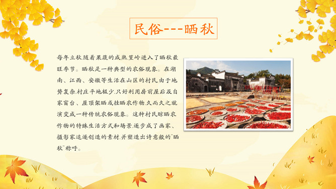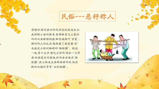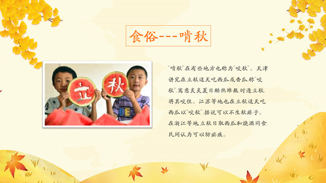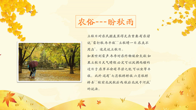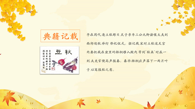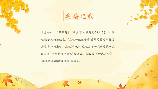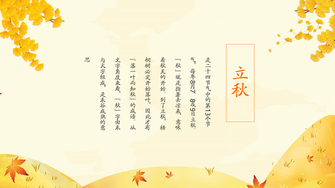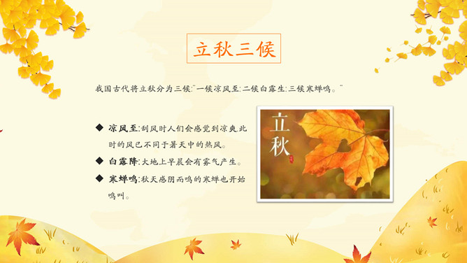 《月令七十二候集解》: “七月节,立字解见春(立春)。秋,揪也,物于此而揪敛也。”立秋一般预示着 炎热的夏天即将过去,秋季即将来临。立秋(节气)以后,秋后下一次雨凉快一次,因而有 “一场秋雨一场寒”的说法。东汉崔 《四民月令》: “朝立秋,冷飕飕;夜立秋,热到头。”