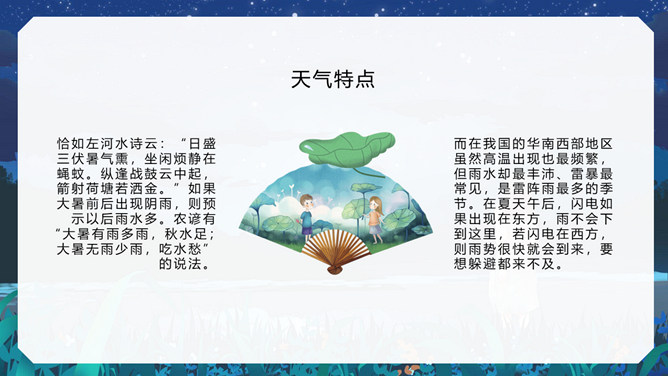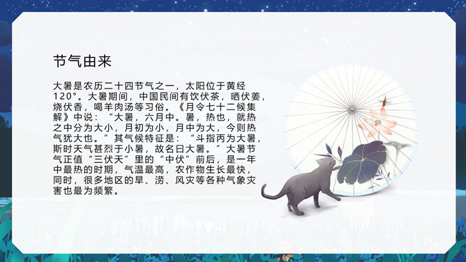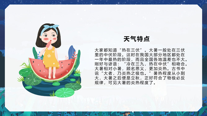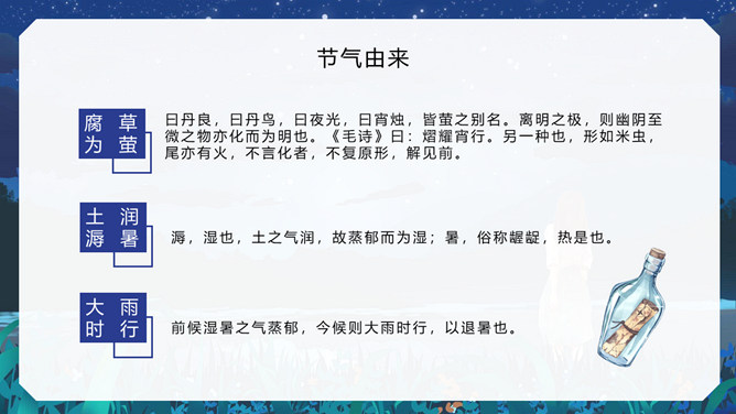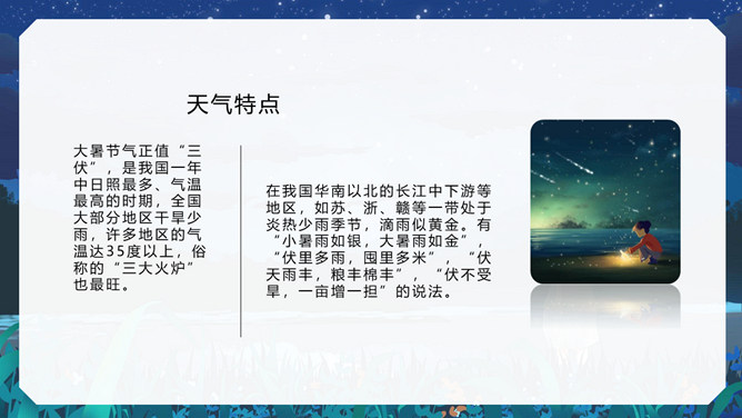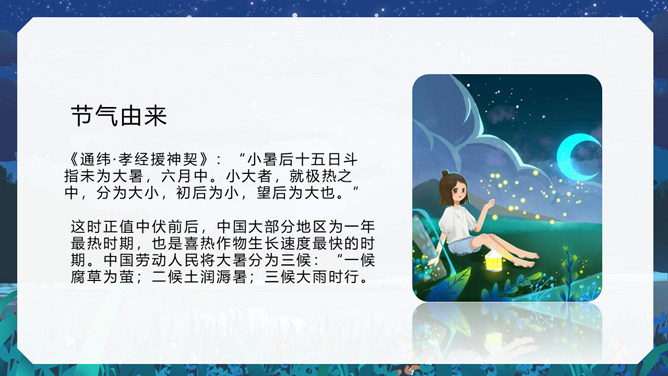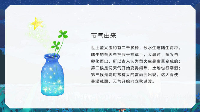 世上萤火虫约有二千多种,分水生与陆生两种,陆生的萤火虫产卵于枯草上,大暑时,萤火虫卵化而出,所以古人认为萤火虫是腐草变成的;第二候是说天气开始变得闷热,土地也很潮湿;第三候是说时常有大的雷雨会出现,这大雨使暑湿减弱,天气开始向立秋过渡。
