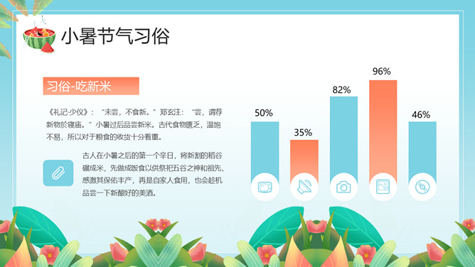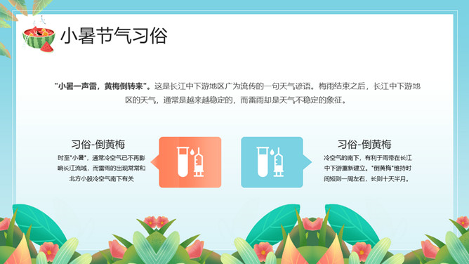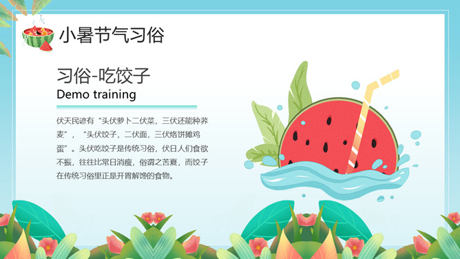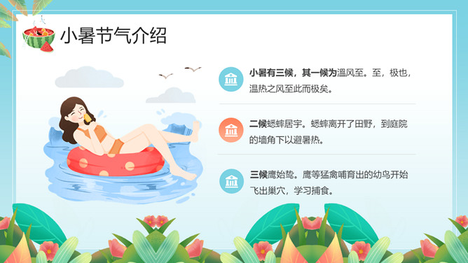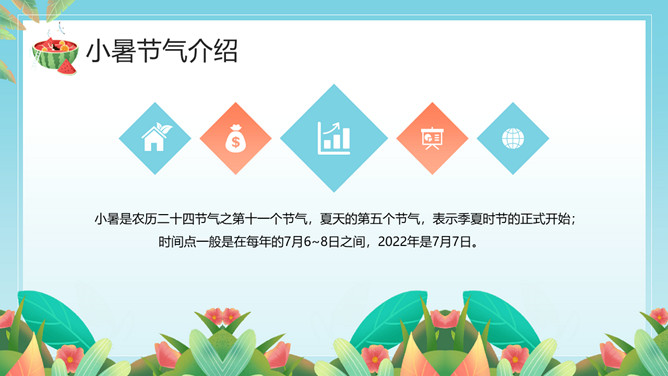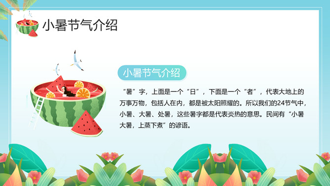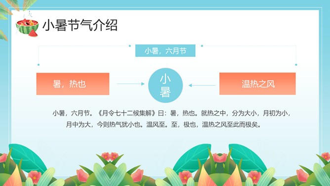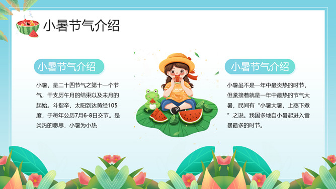 小女孩果汁小暑节气PPT模板。小暑,是二十四节气之第十一个节气,干支历午月的结束以及未月的起始。斗指辛,太阳到达黄经105度,于每年公历7月6-8日交节。是炎热的意思,小暑为小热。