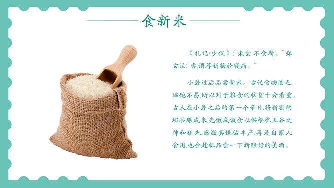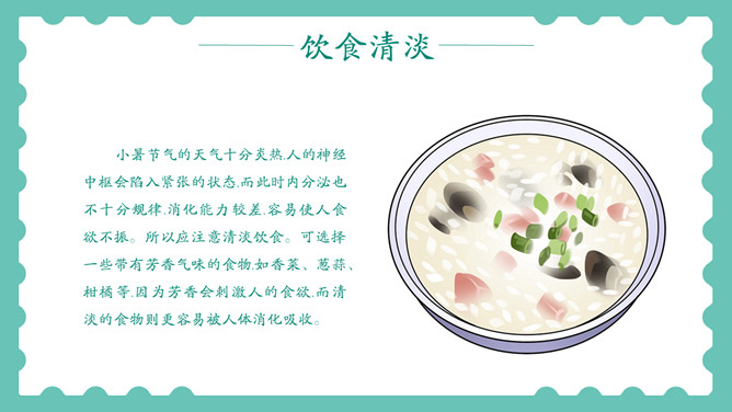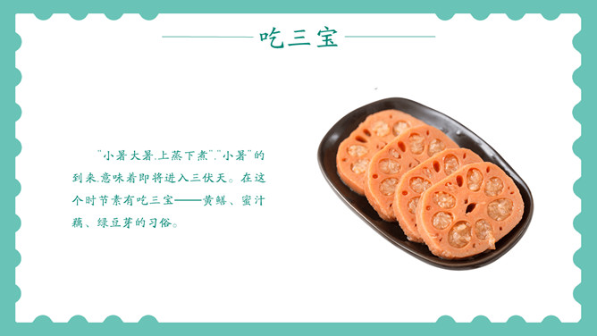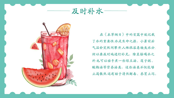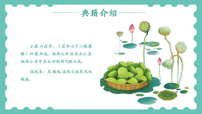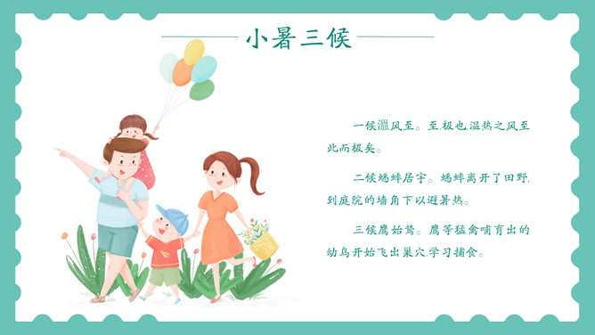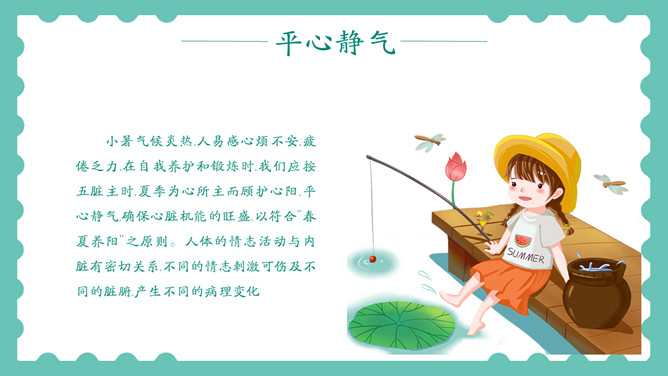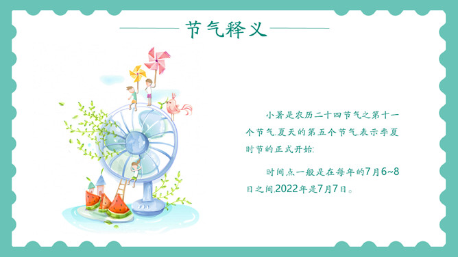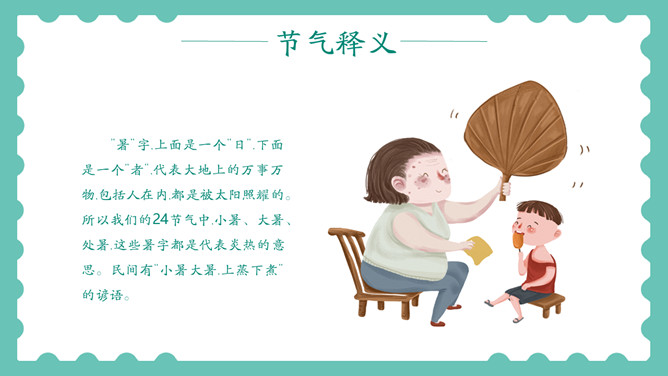 小女孩猫咪小暑节气PPT模板。“暑”字,上面是一个“日”,下面是一个“者”,代表大地上的万事万物,包括人在内,都是被太阳照耀的。所以我们的24节气中,小暑、大暑、处暑,这些暑字都是代表炎热的意思。民间有“小暑大暑,上蒸下煮”的谚语。