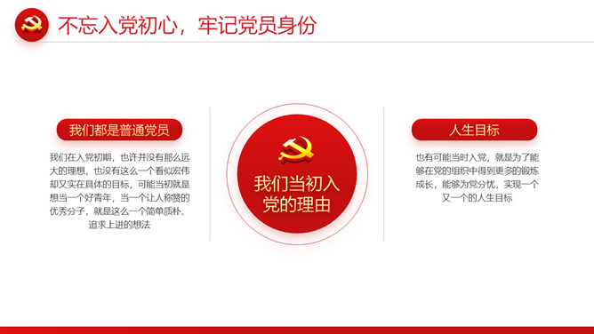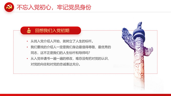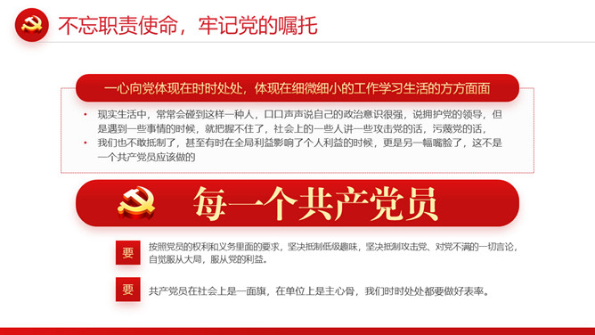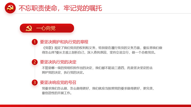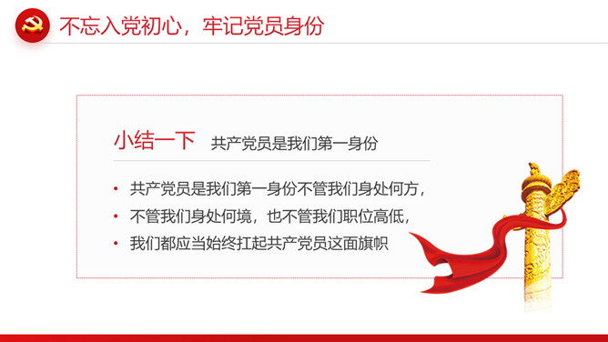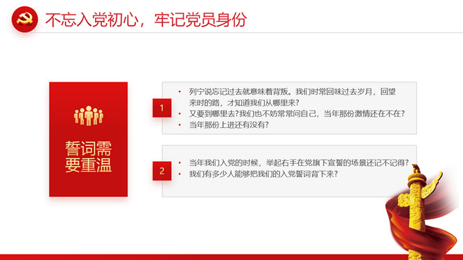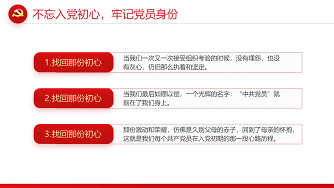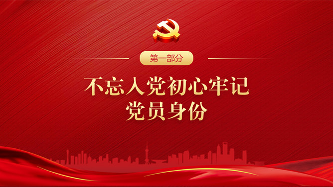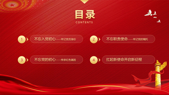 忆光辉党史建党节PPT模板。内容包括不忘入党初心,牢记党员身份;不忘职责使命,牢记党的嘱托;不忘党的初心,传承红色基因;扛起新使命开启新征程。