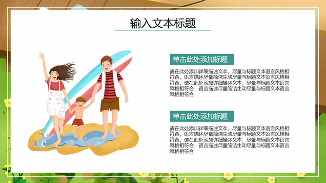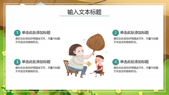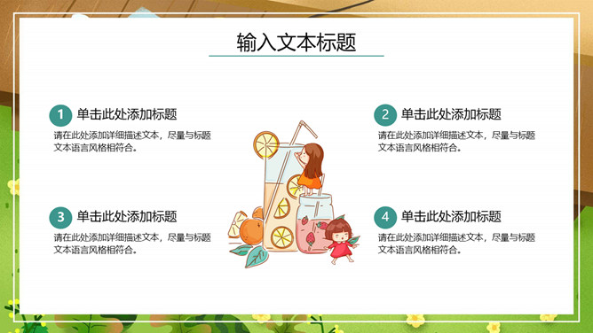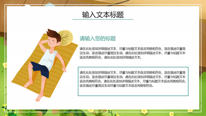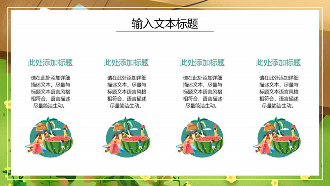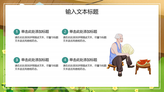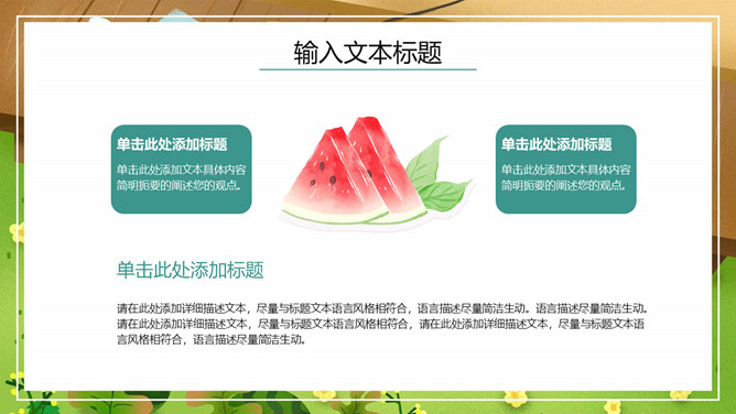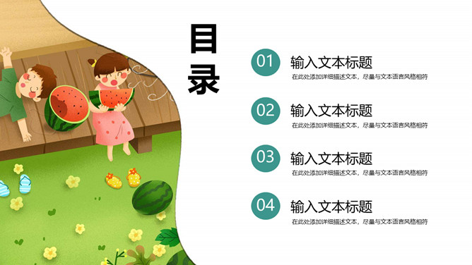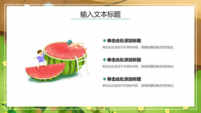 小男孩小女孩西瓜夏至PPT模板。中国民间把夏至后的15天分成3“时”,一般头时3天,中时5天,末时7天。这期间我国大部分地区气温较高,日照充足,作物生长很快,生理和生态需水均较多。此时的降水对农业产量影响很大,有“夏至雨点值千金”之说。