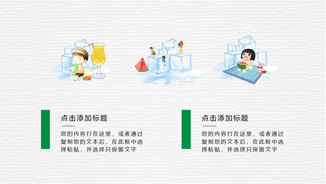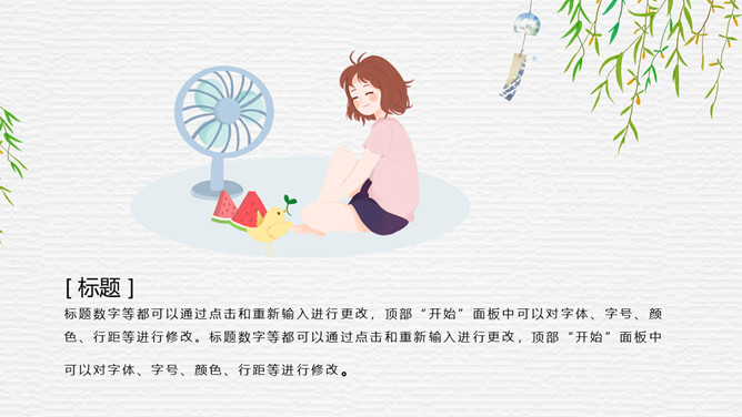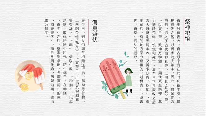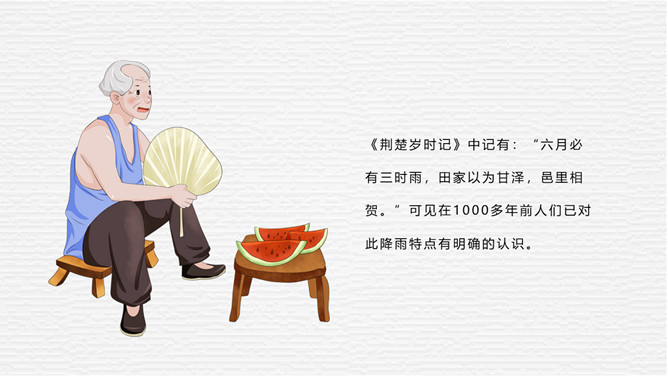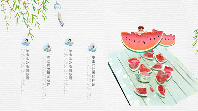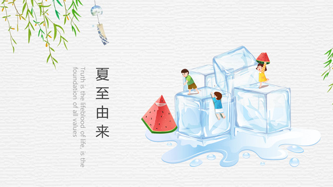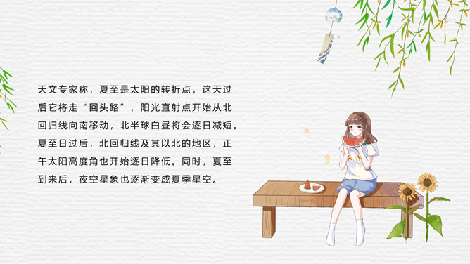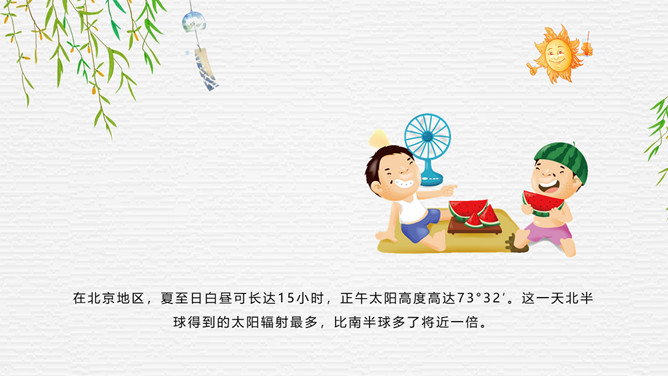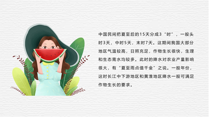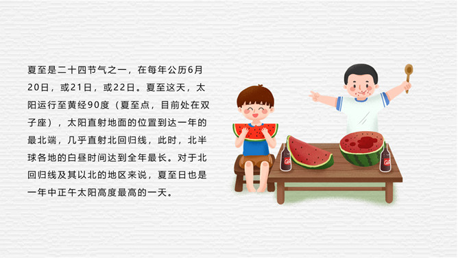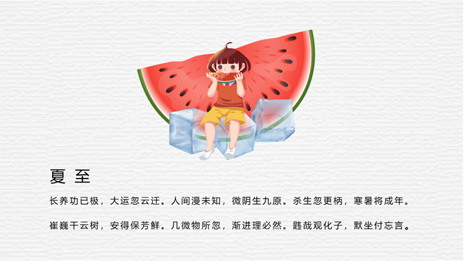 小女孩吃西瓜夏至节气PPT模板。天文专家称,夏至是太阳的转折点,这天过后它将走“回头路”,阳光直射点开始从北回归线向南移动,北半球白昼将会逐日减短。夏至日过后,北回归线及其以北的地区,正午太阳高度角也开始逐日降低。同时,夏至到来后,夜空星象也逐渐变成夏季星空。