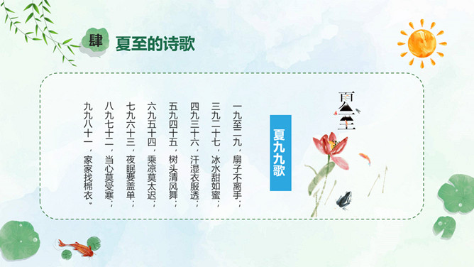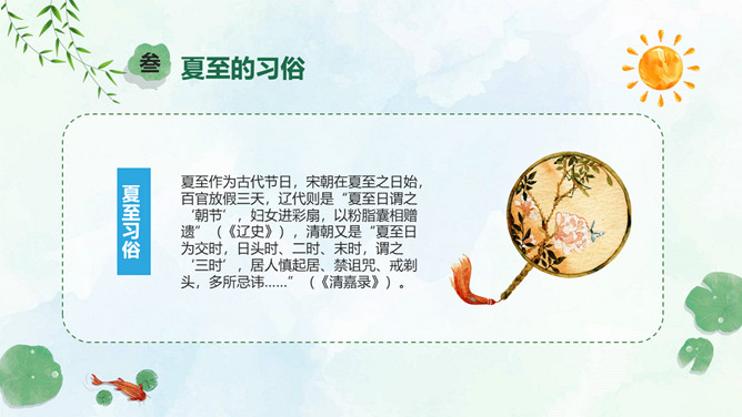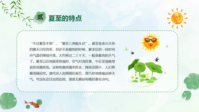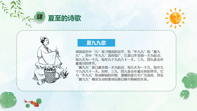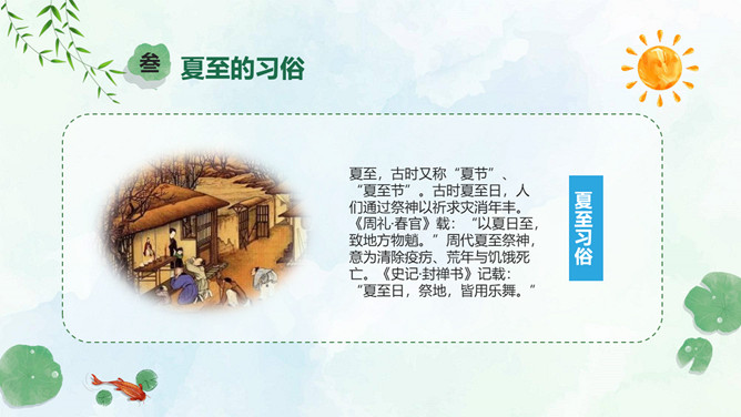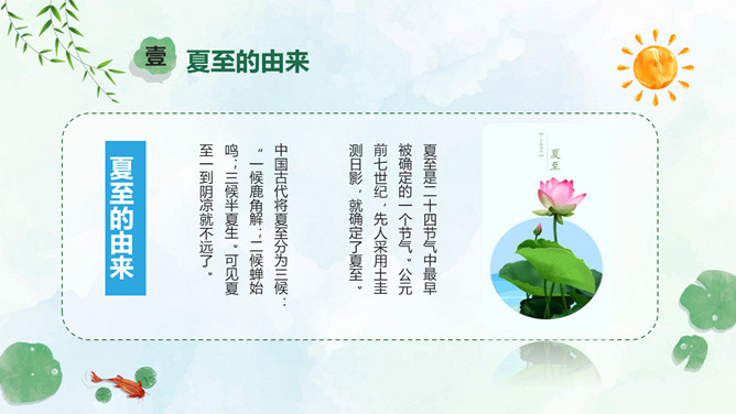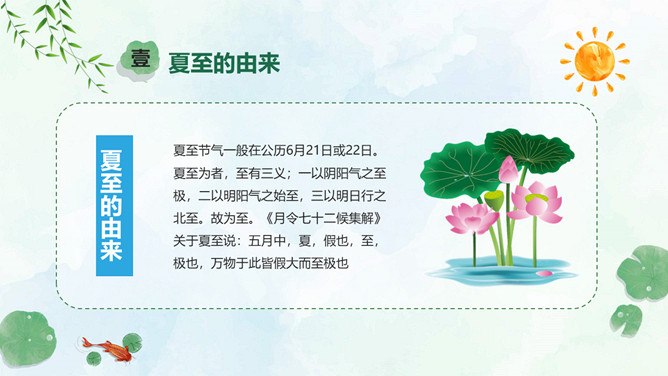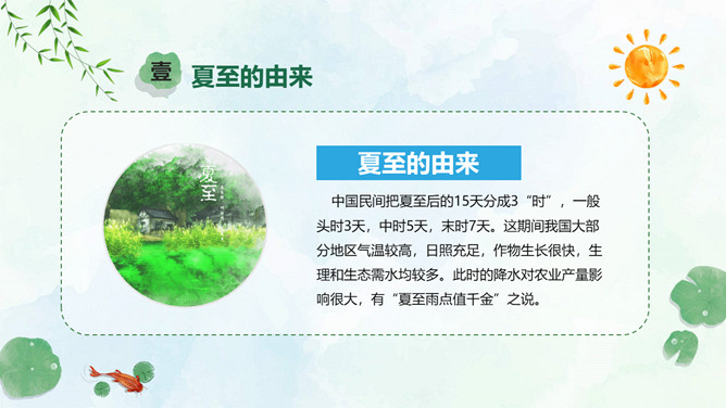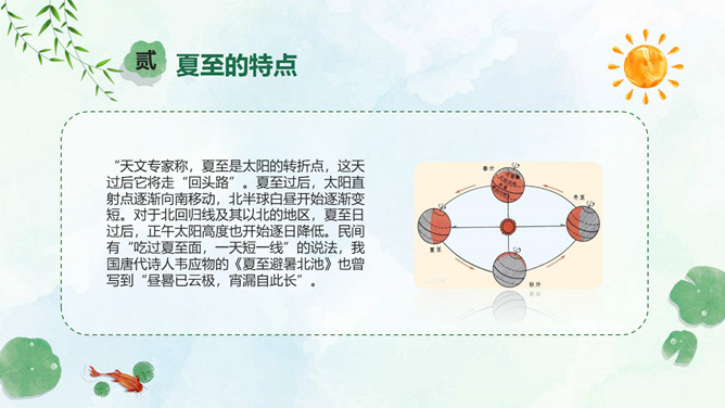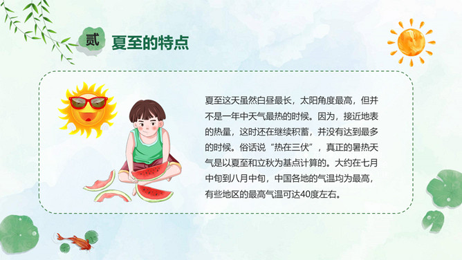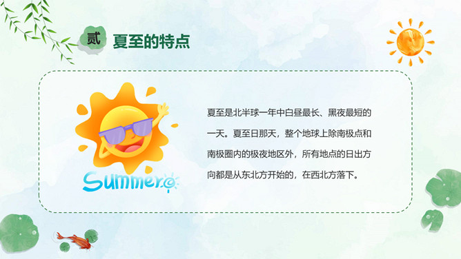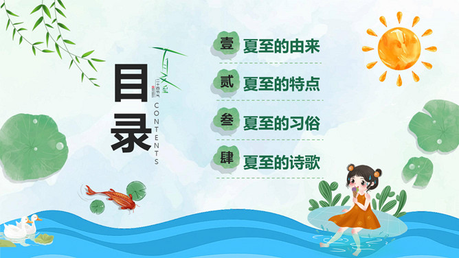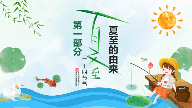 小女孩钓鱼夏至节气PPT模板。夏至是北半球一年中白昼最长、黑夜最短的一天。夏至日那天,整个地球上除南极点和南极圈内的极夜地区外,所有地点的日出方向都是从东北方开始的,在西北方落下。