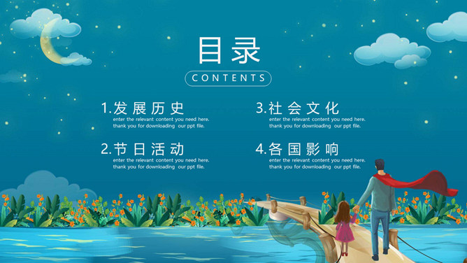 夜空下父女父亲节PPT模板。父亲节(Father's Day),顾名思义是感恩父亲的节日。约始于二十世纪初,起源于美国,现已广泛流传于世界各地,节日日期因地域而存在差异。