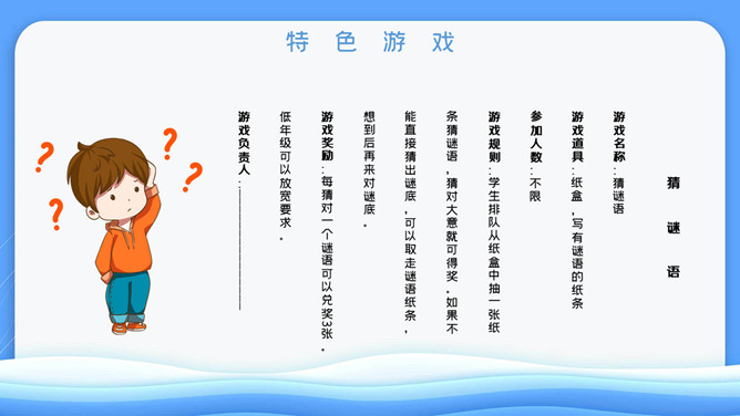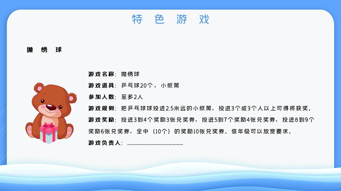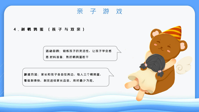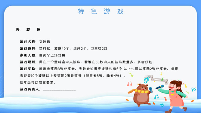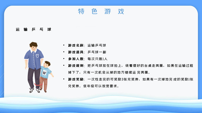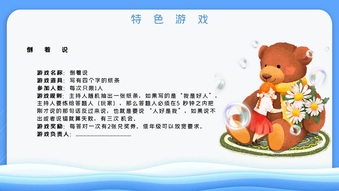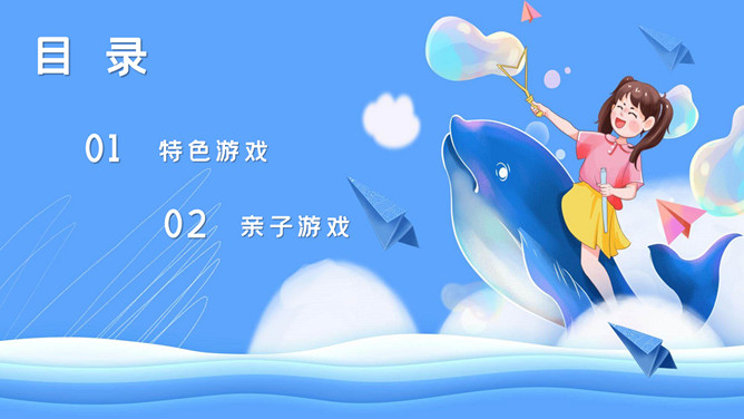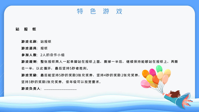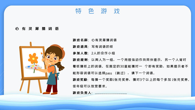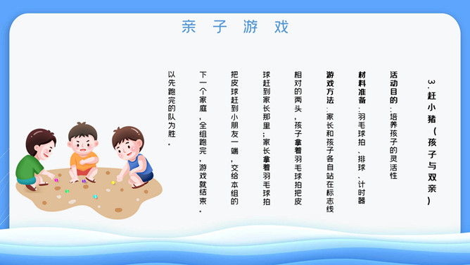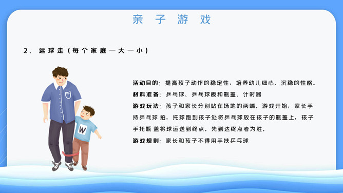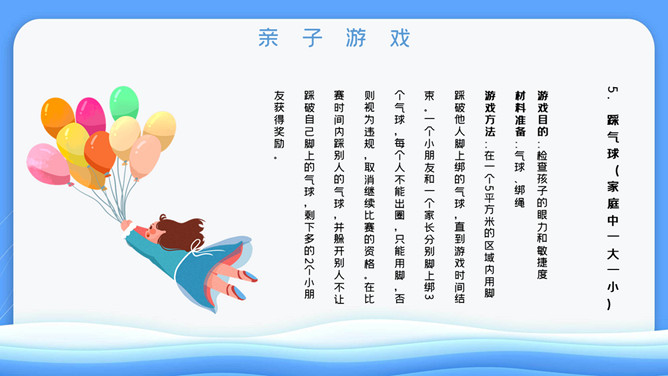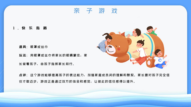 六一儿童节小游戏活动PPT模板。这个游戏能够提高孩子的表达能力,加强家庭成员间的理解和默契。家长要对孩子完全信任才敢迈步,游戏正是通过双方的体会和感觉,让彼此的信任感得以提升。