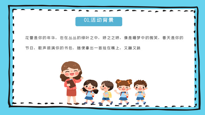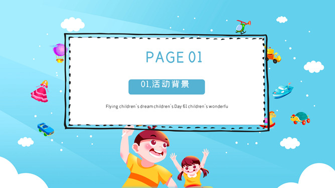 放飞童梦儿童节活动策划PPT模板。花蕾是你的年华,包在丛丛的绿叶之中,娇之之娇,像是睡梦中的微笑,春天是你的节日,歌声装满你的书包,随便拿出一首挂在嘴上,又蹦又跳。