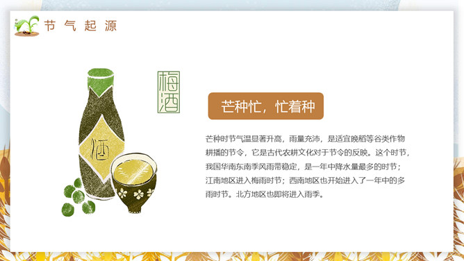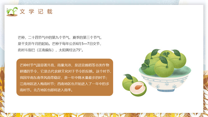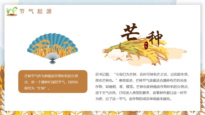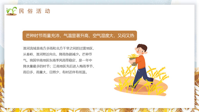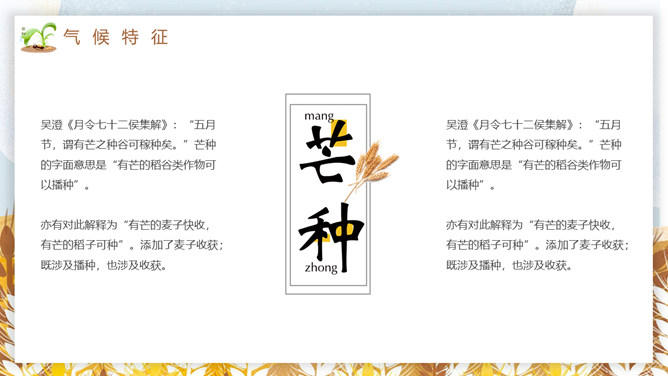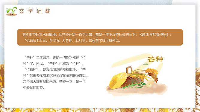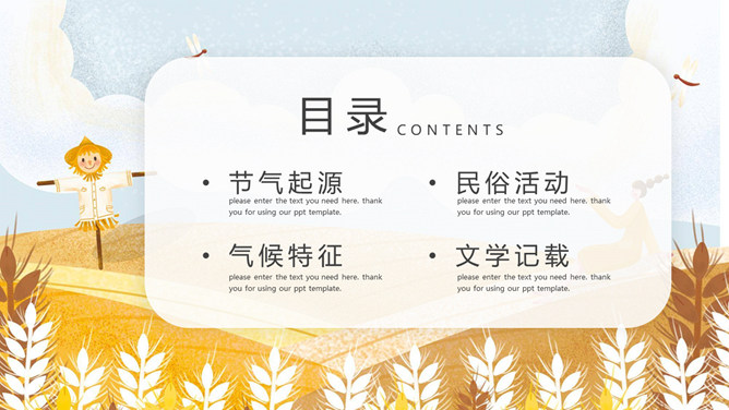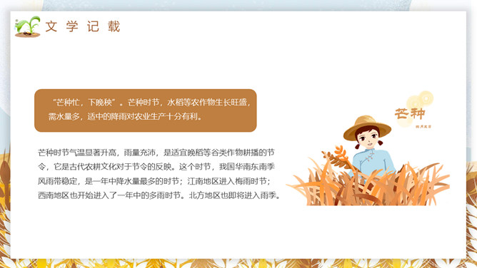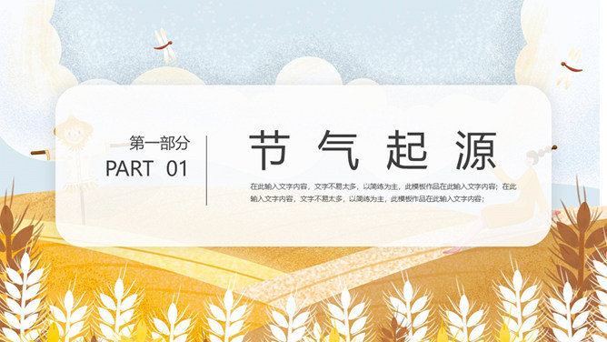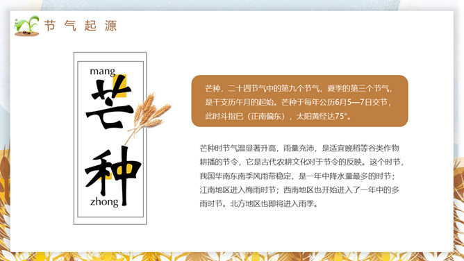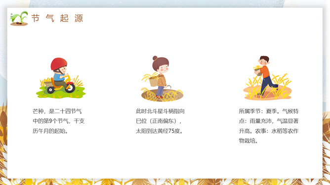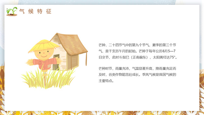 麦田稻草人芒种节气PPT模板。芒种,二十四节气中的第九个节气,夏季的第三个节气,是干支历午月的起始。芒种于每年公历6月5—7日交节,此时斗指巳(正南偏东),太阳黄经达75°。