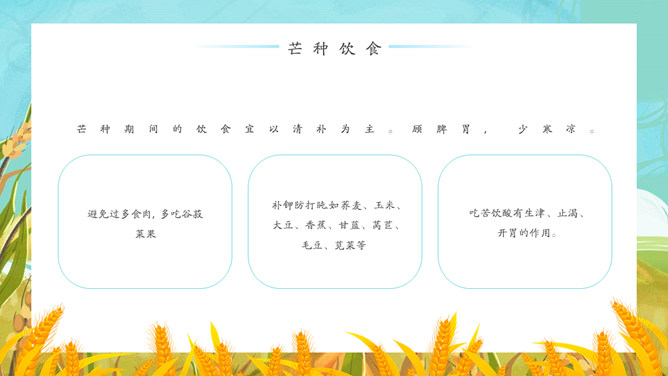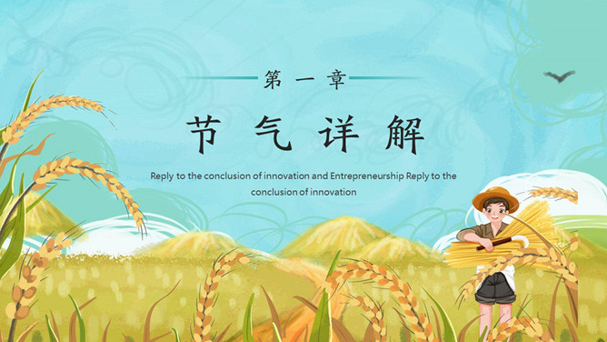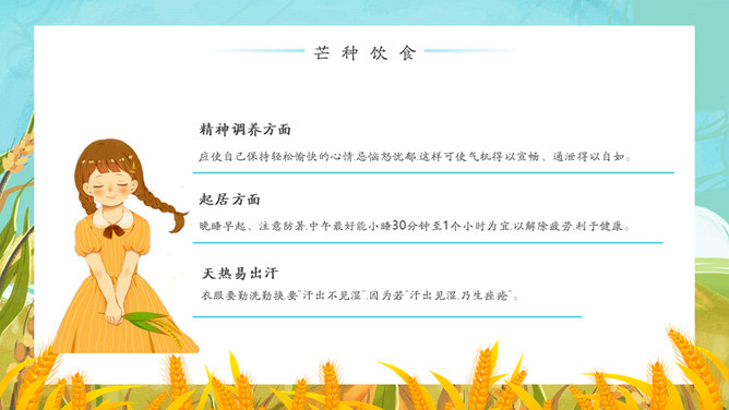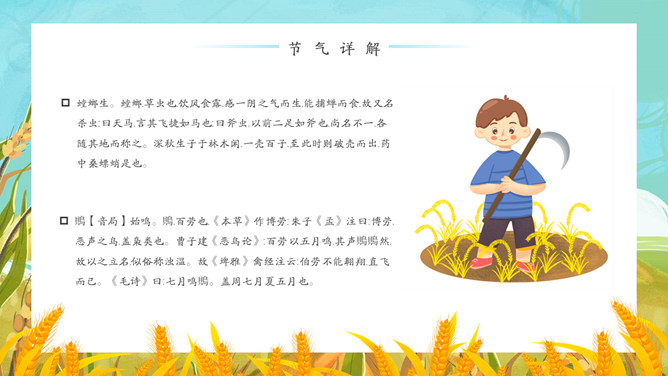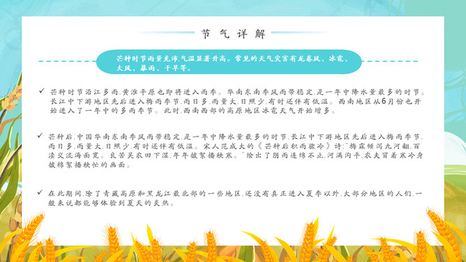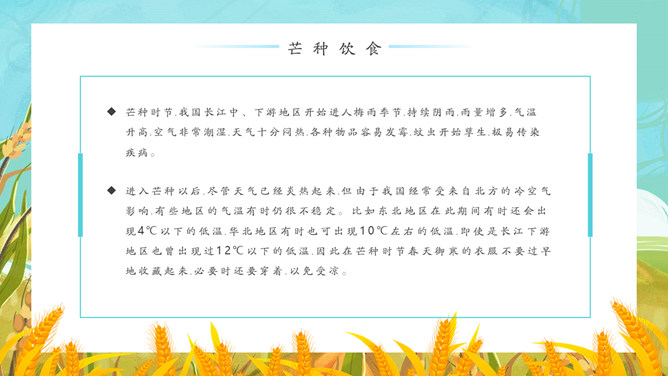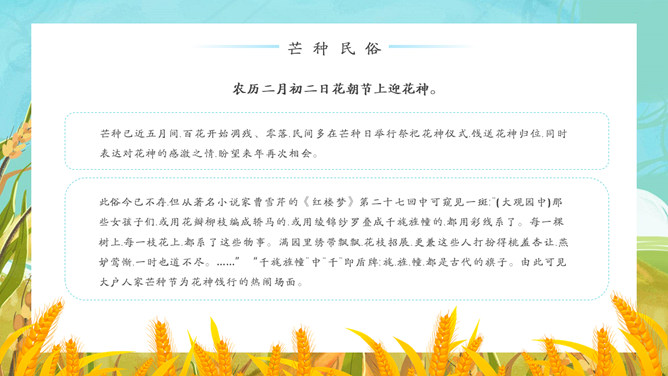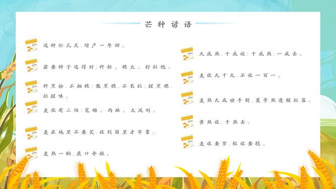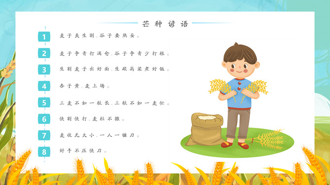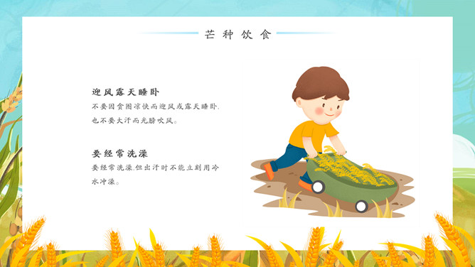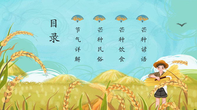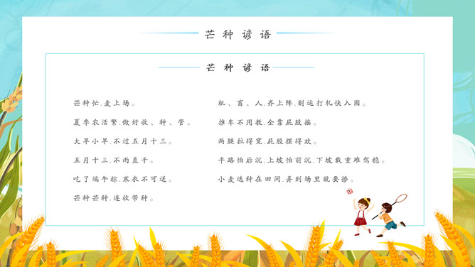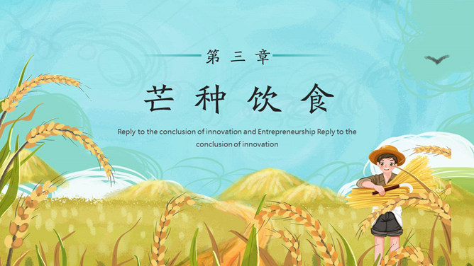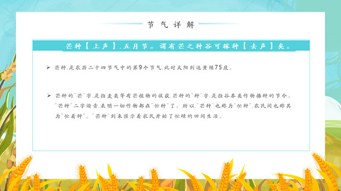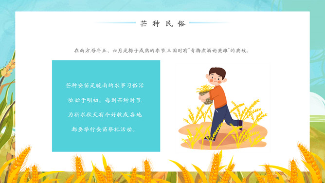 麦田农民芒种节气PPT模板。芒种的“芒”字,是指麦类等有芒植物的收获,芒种的“种”字,是指谷黍类作物播种的节令。“芒种”二字谐音,表明一切作物都在“忙种”了。所以,“芒种”也称为“忙种”,农民间也称其为“忙着种”。“芒种”到来预示着农民开始了忙碌的田间生活。