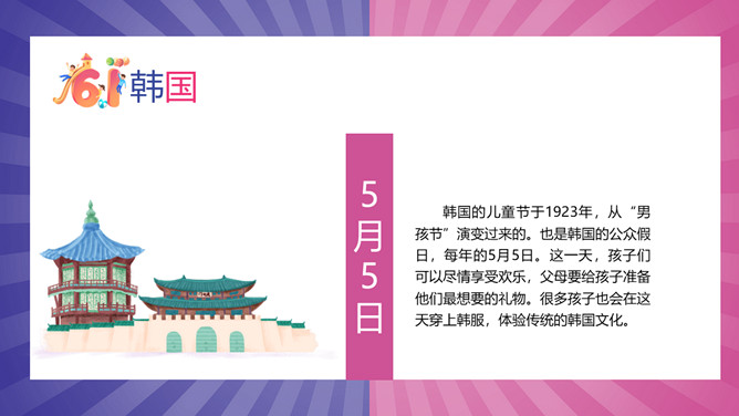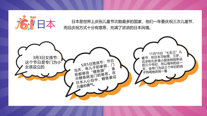 六一儿童节主题班会PPT模板。日本是世界上庆祝儿童节次数最多的国家,他们一年要庆祝三次儿童节,而且庆祝方式十分有意思,充满了浓浓的日本风情。