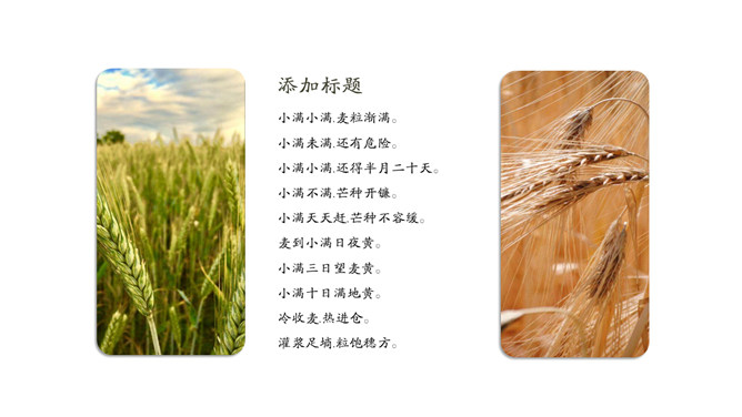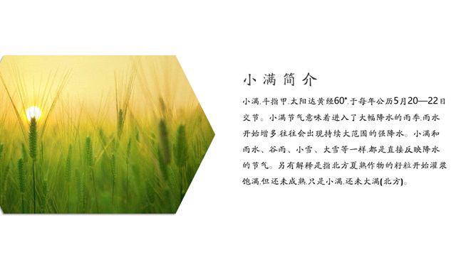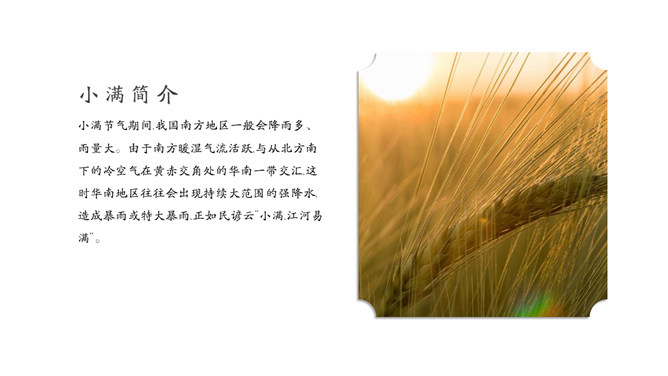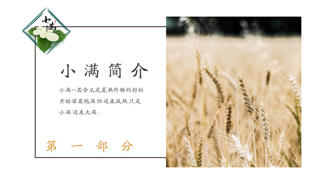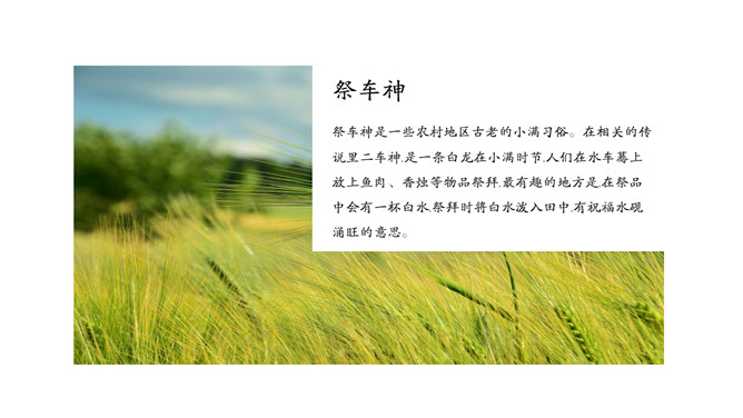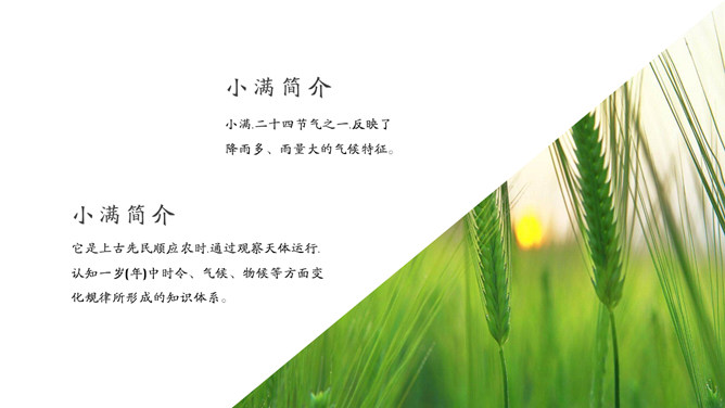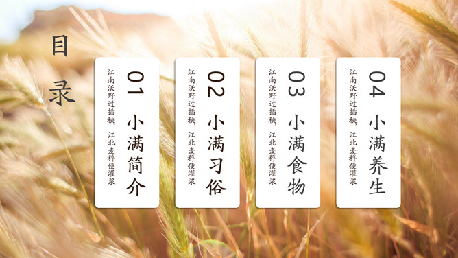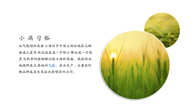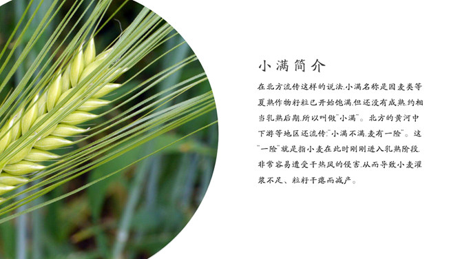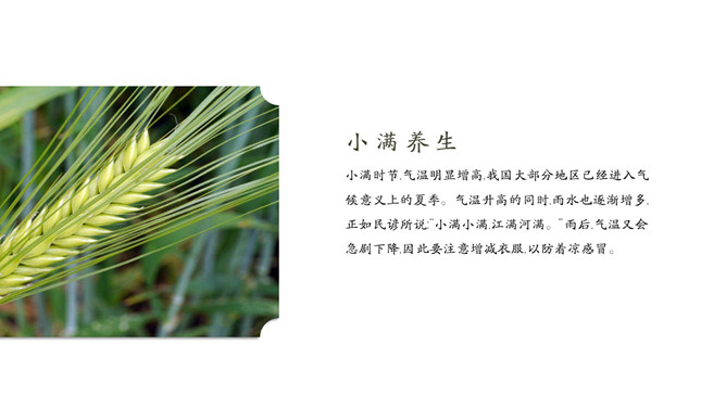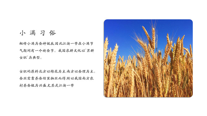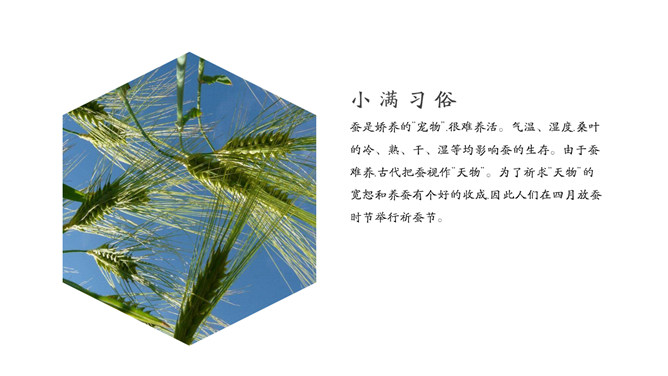 麦穗麦田小满节气PPT模板。相传小满为蚕神诞辰,因此江浙一带在小满节气期间有一个祈蚕节。我国农耕文化以“男耕女织”为典型。女织的原料北方以棉花为主,南方以蚕理为主。蚕丝需靠养蚕结茧抽丝而得,所以我国南方农村养蚕极为兴盛,尤其是江浙一带。
