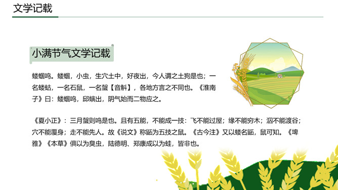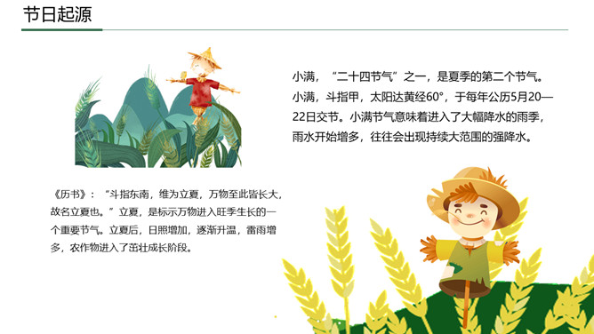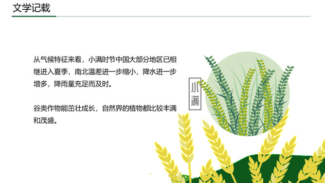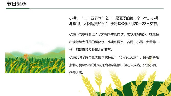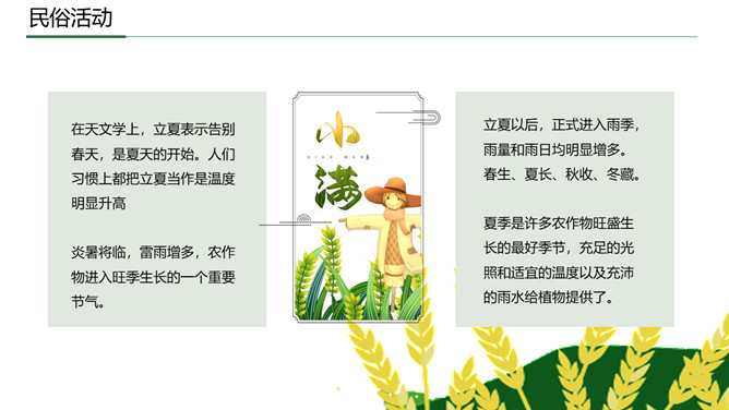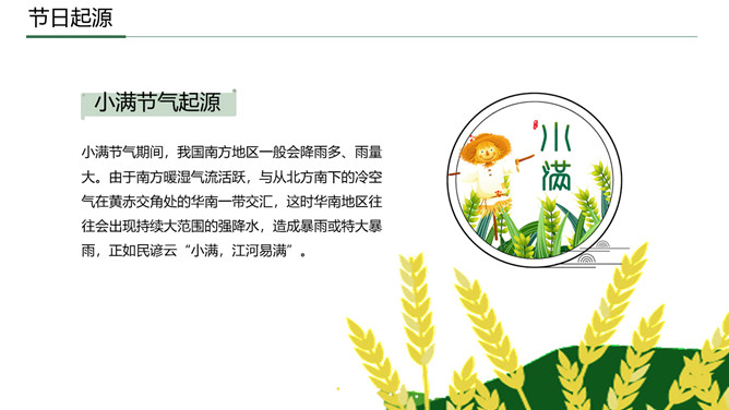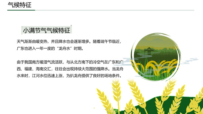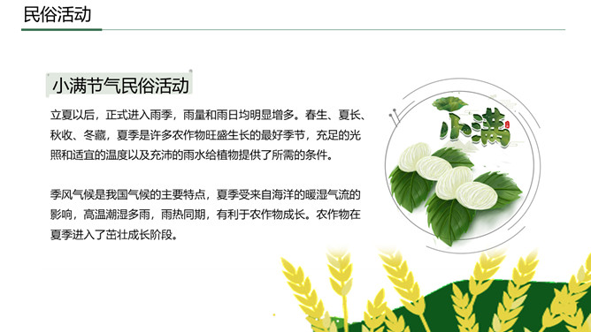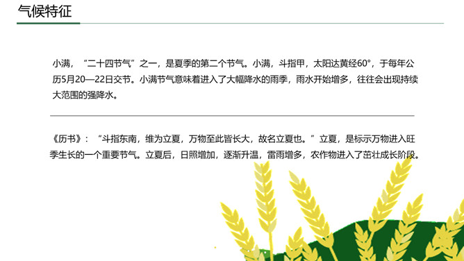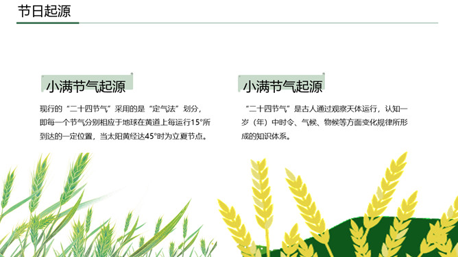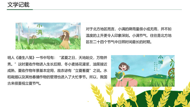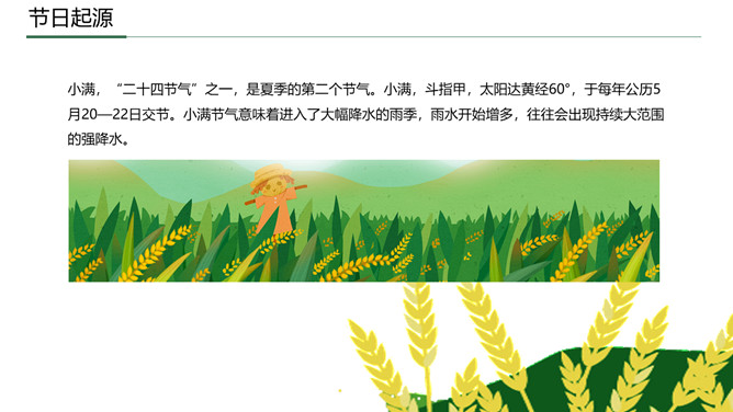群山麦穗小满节气PPT模板。对于北方地区而言,小满的降雨量很小或无雨,并不如温度的上升更令人印象深刻。小满节气,往往是北方地区在二十四个节气中日照时间最长的时期。