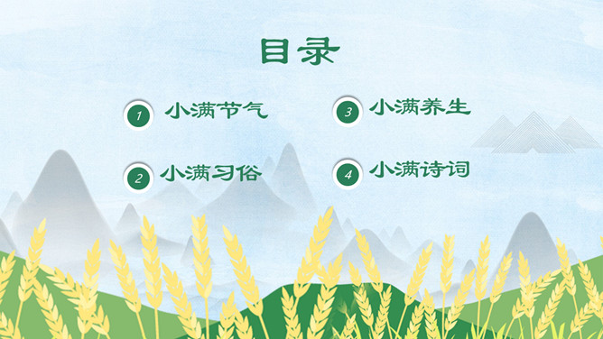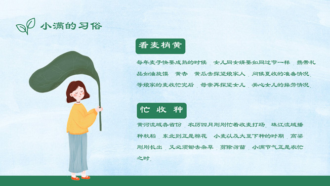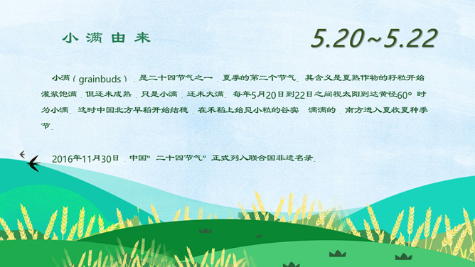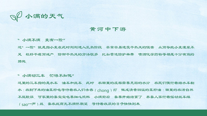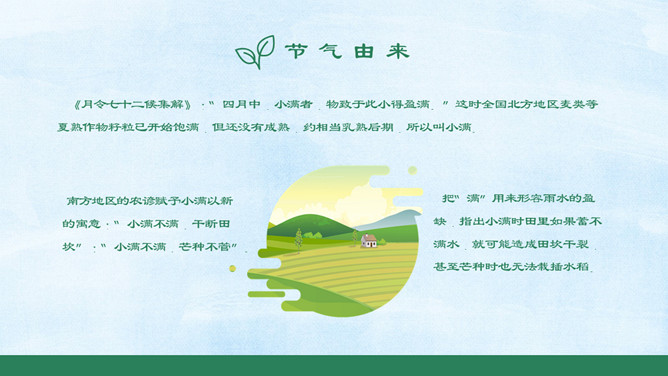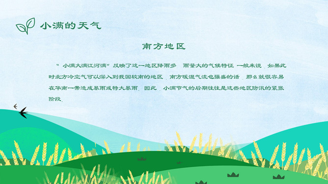 燕子田野小满节气PPT模板。对于长江中下游地区来说,如果这个阶段雨水偏少,可能是太平洋上的副热带高压势力较弱,位置偏南,意味着到了黄梅时节,降水可能就会偏少。因此有民谚说“小满不下,黄梅偏少”;“小满无雨,芒种无水”。