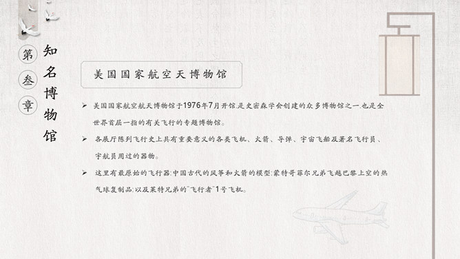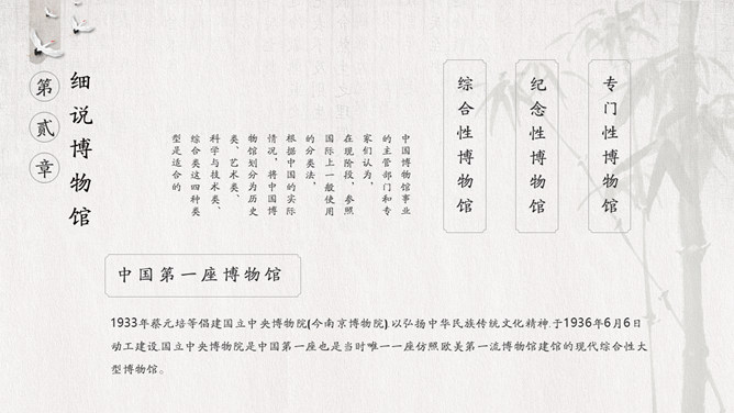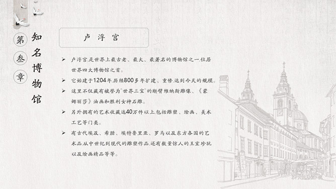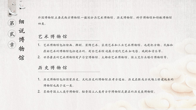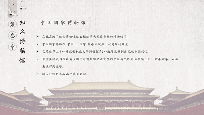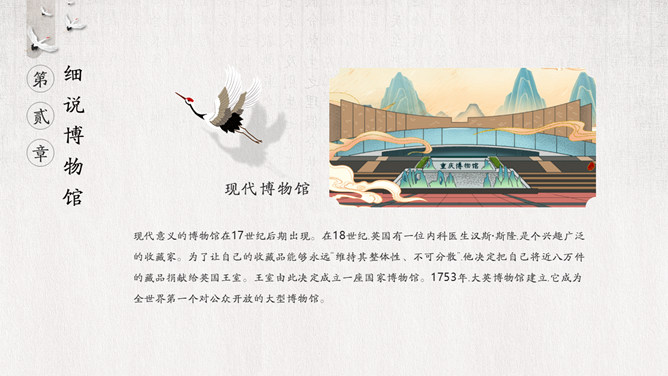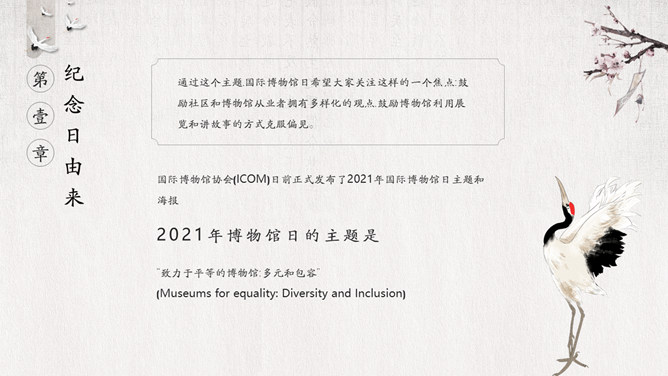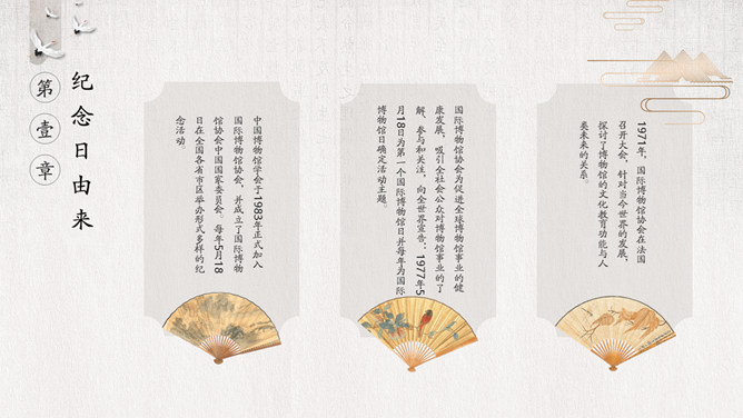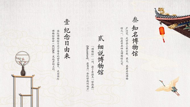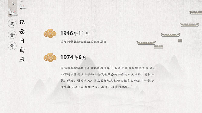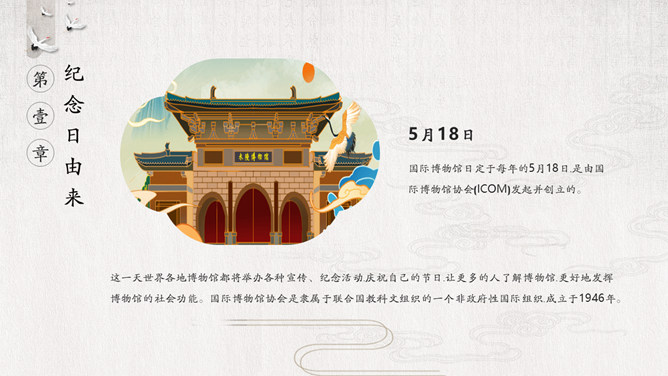 国际博物馆日介绍PPT模板。国际博物馆日定于每年的5月18日,是由国际博物馆协会(ICOM)发起并创立的。这一天世界各地博物馆都将举办各种宣传、纪念活动,庆祝自己的节日,让更多的人了解博物馆,更好地发挥博物馆的社会功能。国际博物馆协会是隶属于联合国教科文组织的一个非政府性国际组织,成立于1946年。