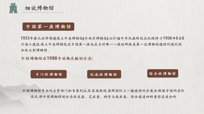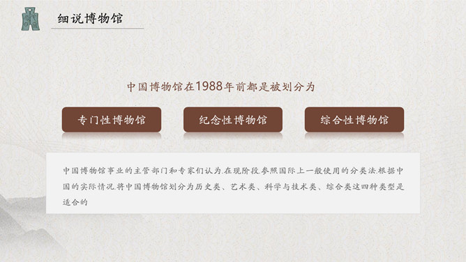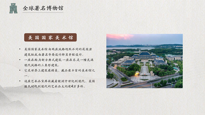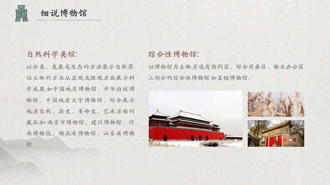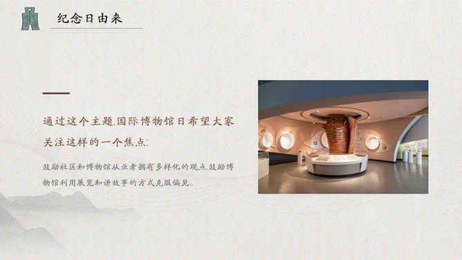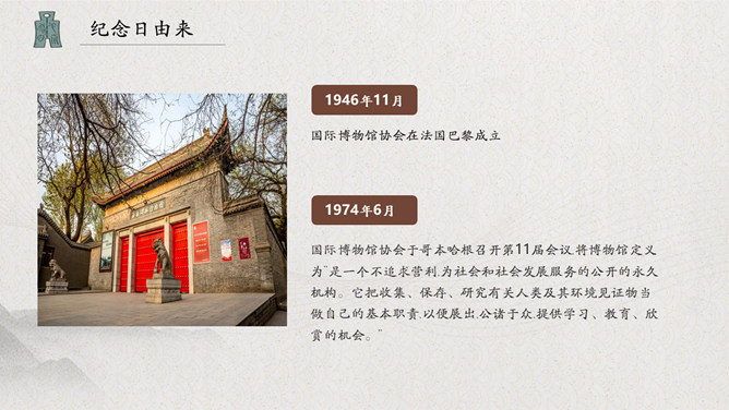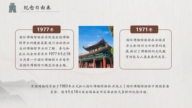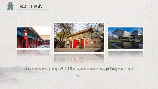 古建筑国际博物馆日PPT模板。中国博物馆学会于1983年正式加入国际博物馆协会,并成立了国际博物馆协会中国国家委员会。每年5月18日在全国各省市区举办形式多样的纪念活动。