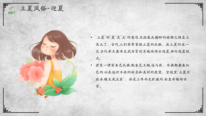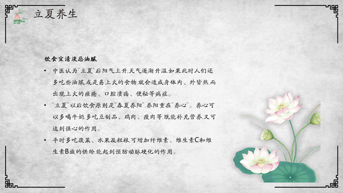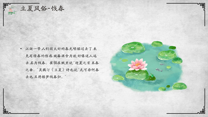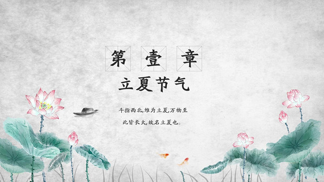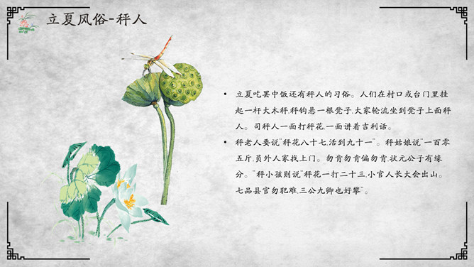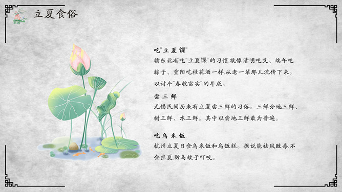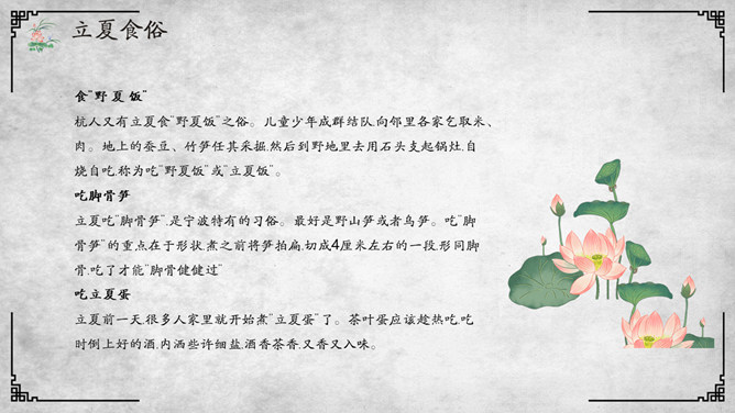荷花立夏节气介绍PPT模板。杭人又有立夏食“野夏饭”之俗。儿童少年成群结队,向邻里各家乞取米、肉。地上的蚕豆、竹笋任其采掘,然后到野地里去用石头支起锅灶,自烧自吃,称为吃“野夏饭”或“立夏饭”。