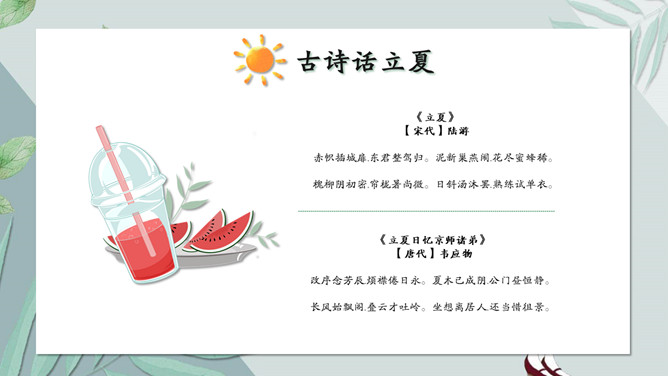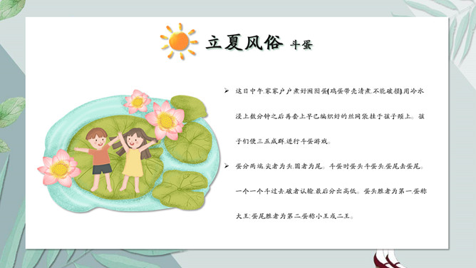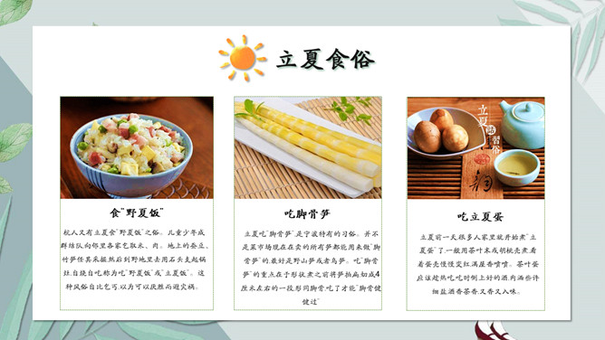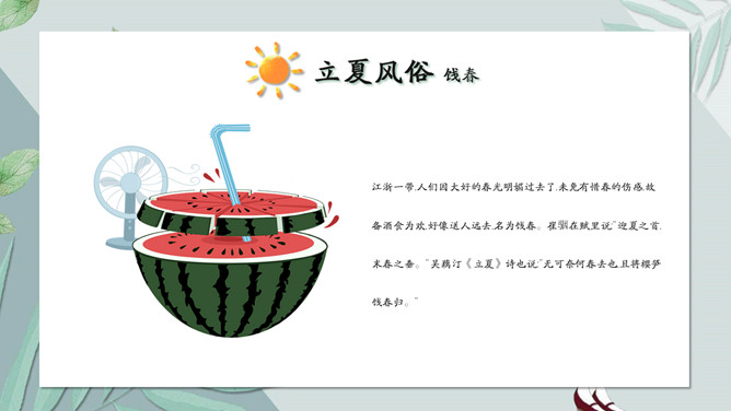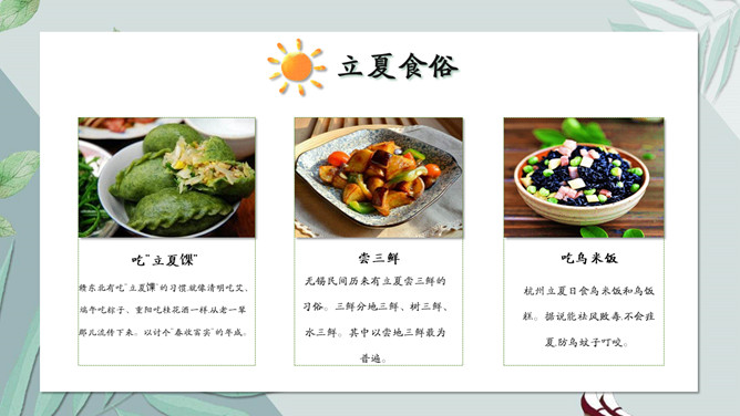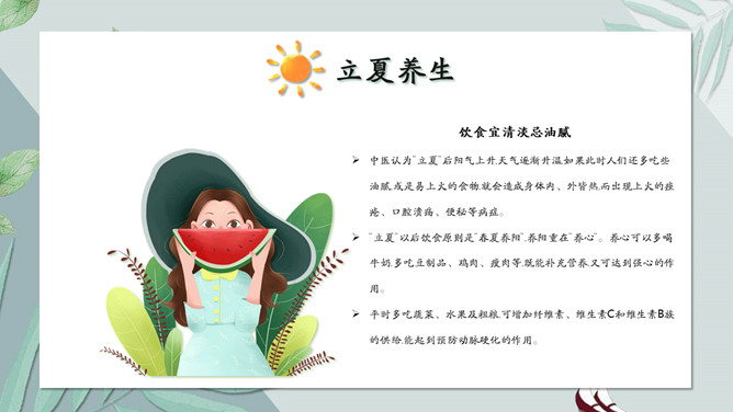 女孩叶子立夏节气PPT模板。无锡民间历来有立夏尝三鲜的习俗。三鲜分地三鲜、树三鲜、水三鲜。其中以尝地三鲜最为普遍。