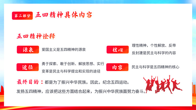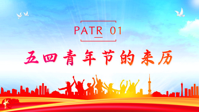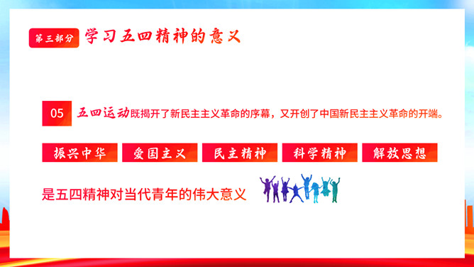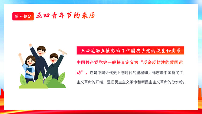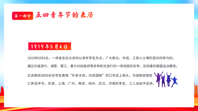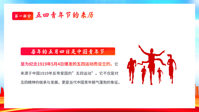 青年节弘扬五四精神团课PPT模板。内容包括五四青年节的来历、五四精神具体内容、学习五四精神的意义、争做新时代有为青年。