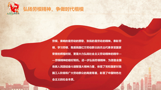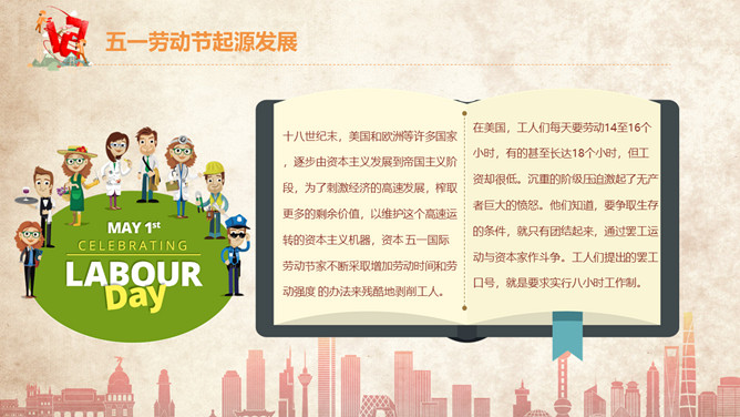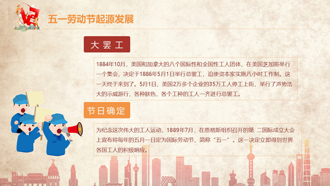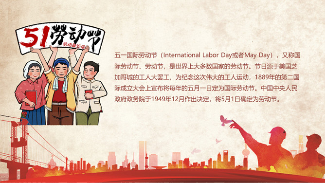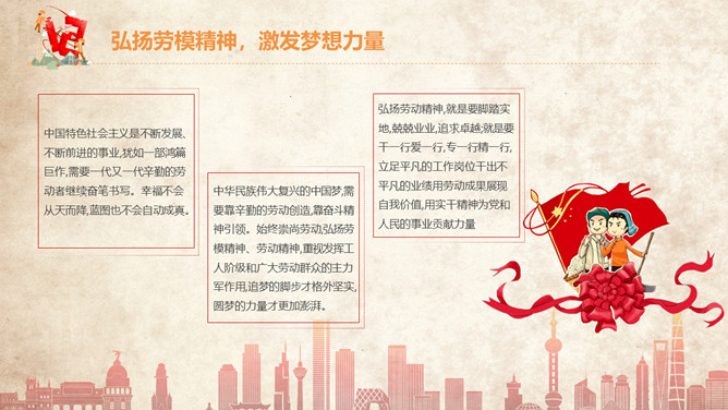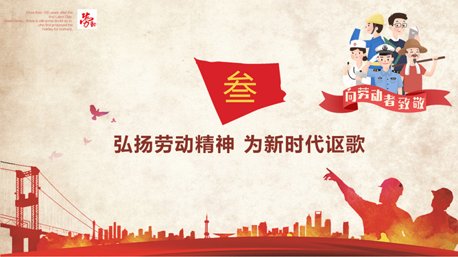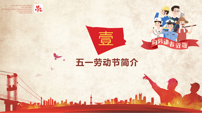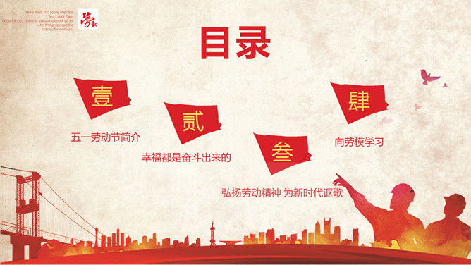中小学劳动节班会PPT模板。内容包括五一劳动节简介、幸福都是奋斗出来的、弘扬劳动精神为新时代讴歌、向劳模学习。